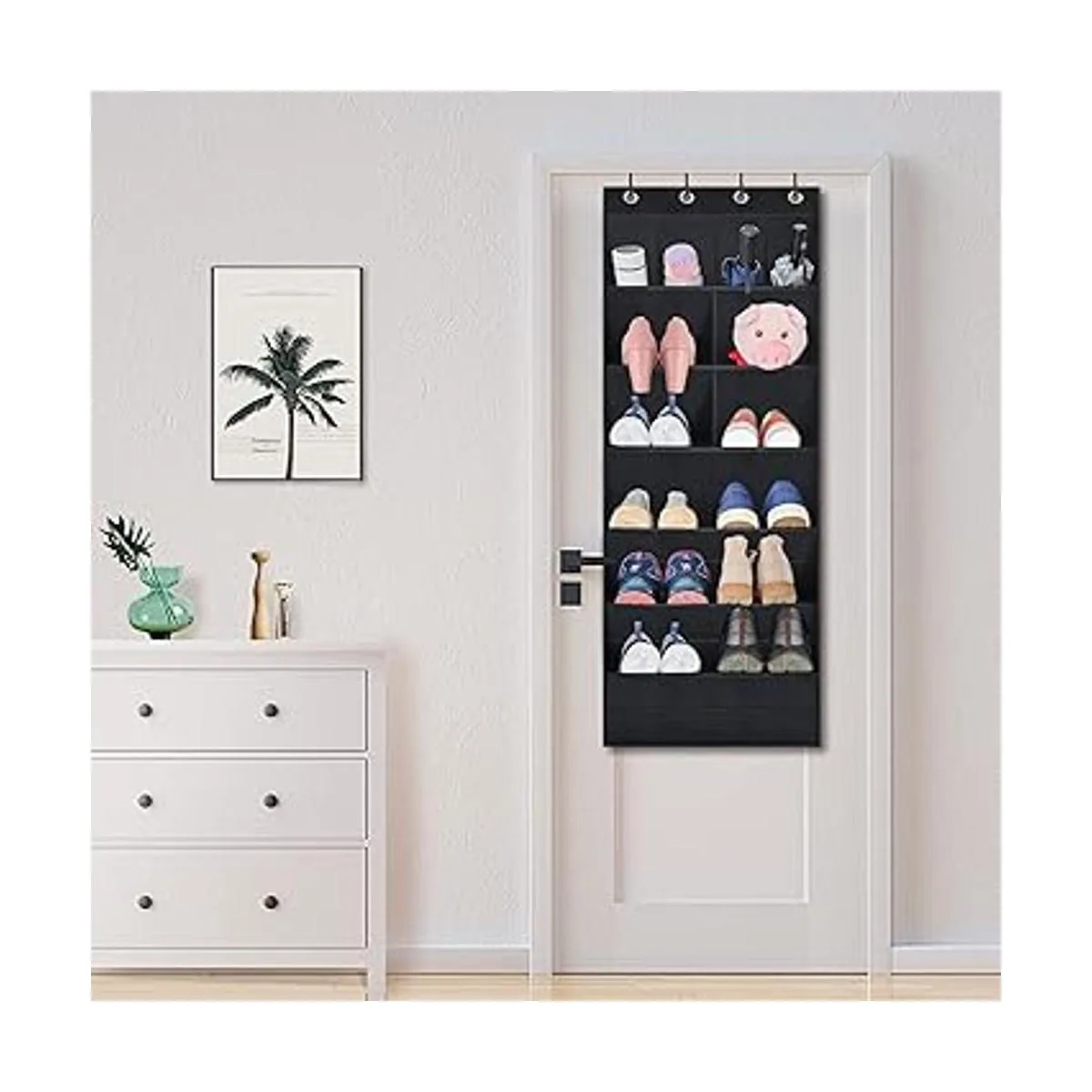 6Layer Large Deep Pocket for More Space: Each over the door shoe organizer measures 16.5W x 6.5D x 48.5H. This door shoe rack can easily hold size 713 shoes, such as kids shoes, flipflops, women high heals and mens boots, etc. Tilt pockets design keeps store and access items more easily. Especially fit for closet door, narrow door, skinny utility door, dorm and RV.