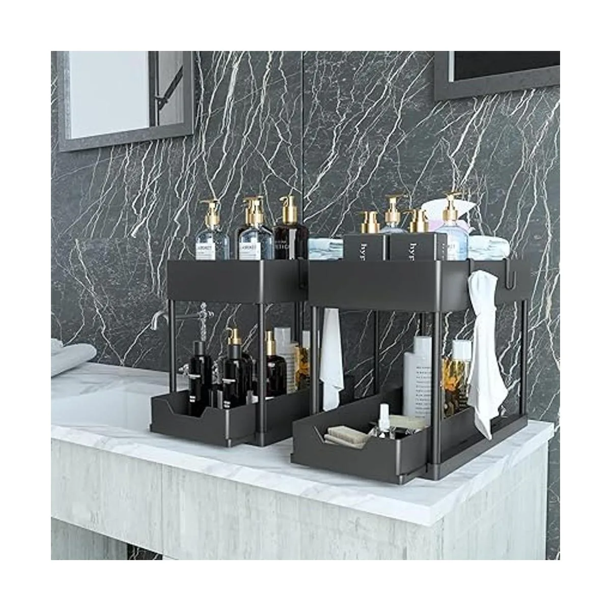 2 Pack Under Sink Organizer with Sliding Cabinet Basket, 2 Tier MultiPurpose Under Sink Organization and Storage for Bathroom Kitchen Includes 4 Extra Hooks