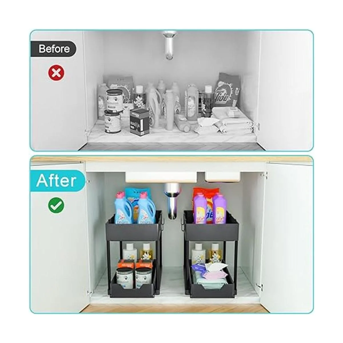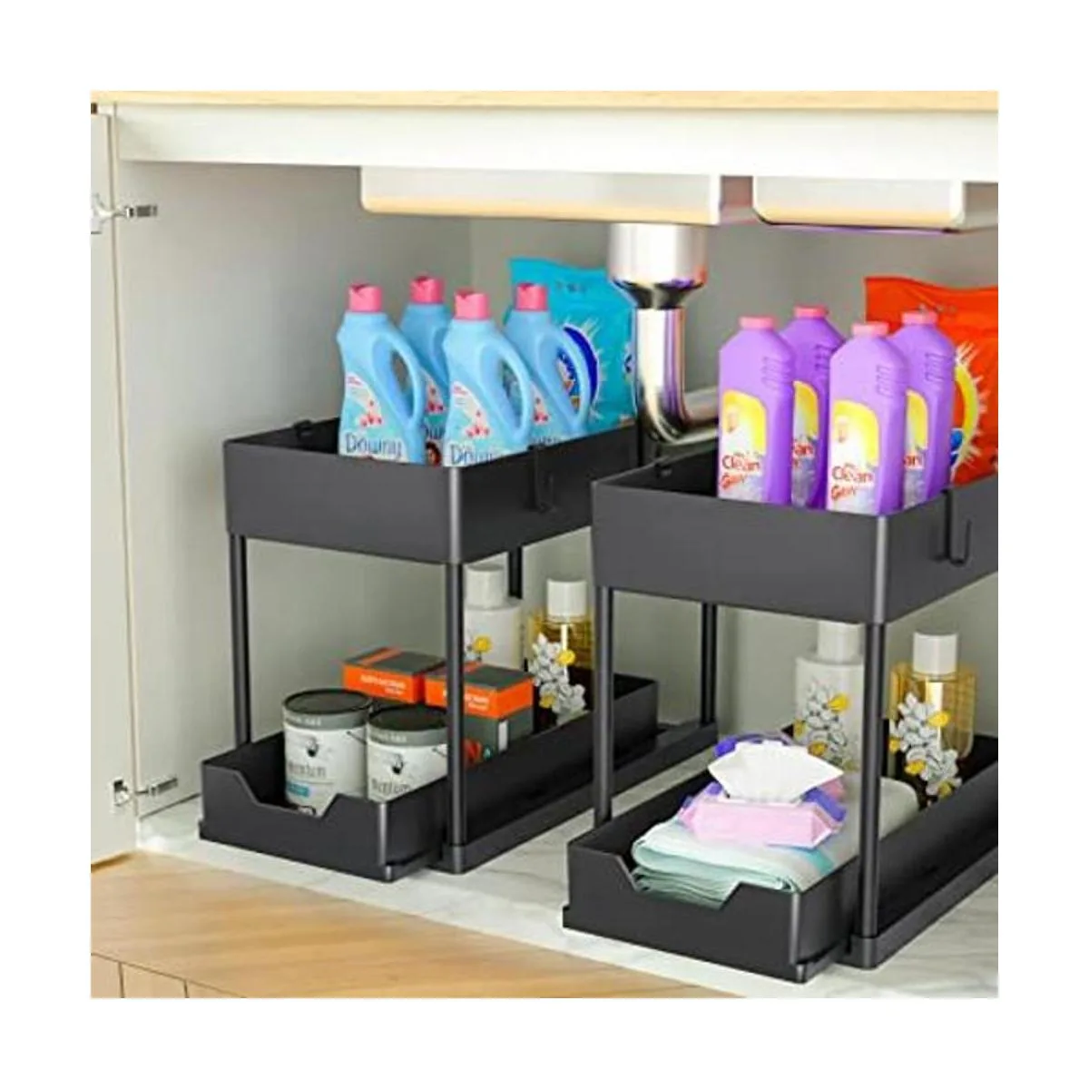 Sliding Storage Drawers This undersink organizer is designed with a double layer. The bottom sliding drawer can be pulled out by the handle, allowing you to easily take items out. It comes with 4 side hooks for hanging small items. Keep your home tidy and maximize your storage space.