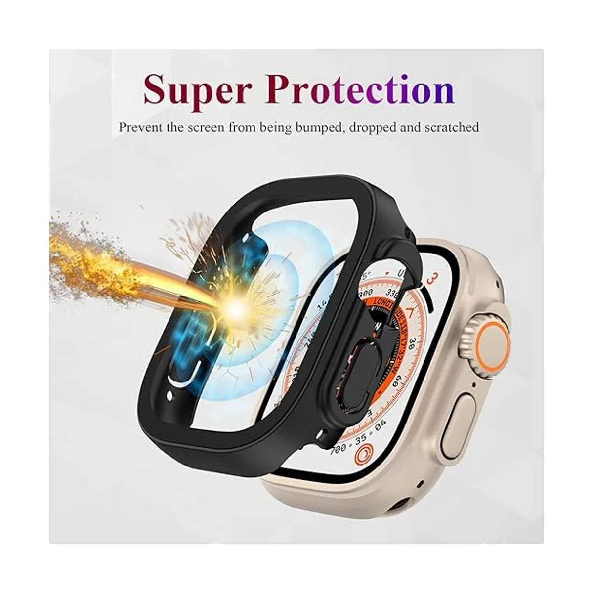 Scratch Resistant The tempered glass screen protector and bumper case 2 in 1 design overall protect for Apple Watch Ultra 49mm face and edges corners of against scratches, drops and bumps.