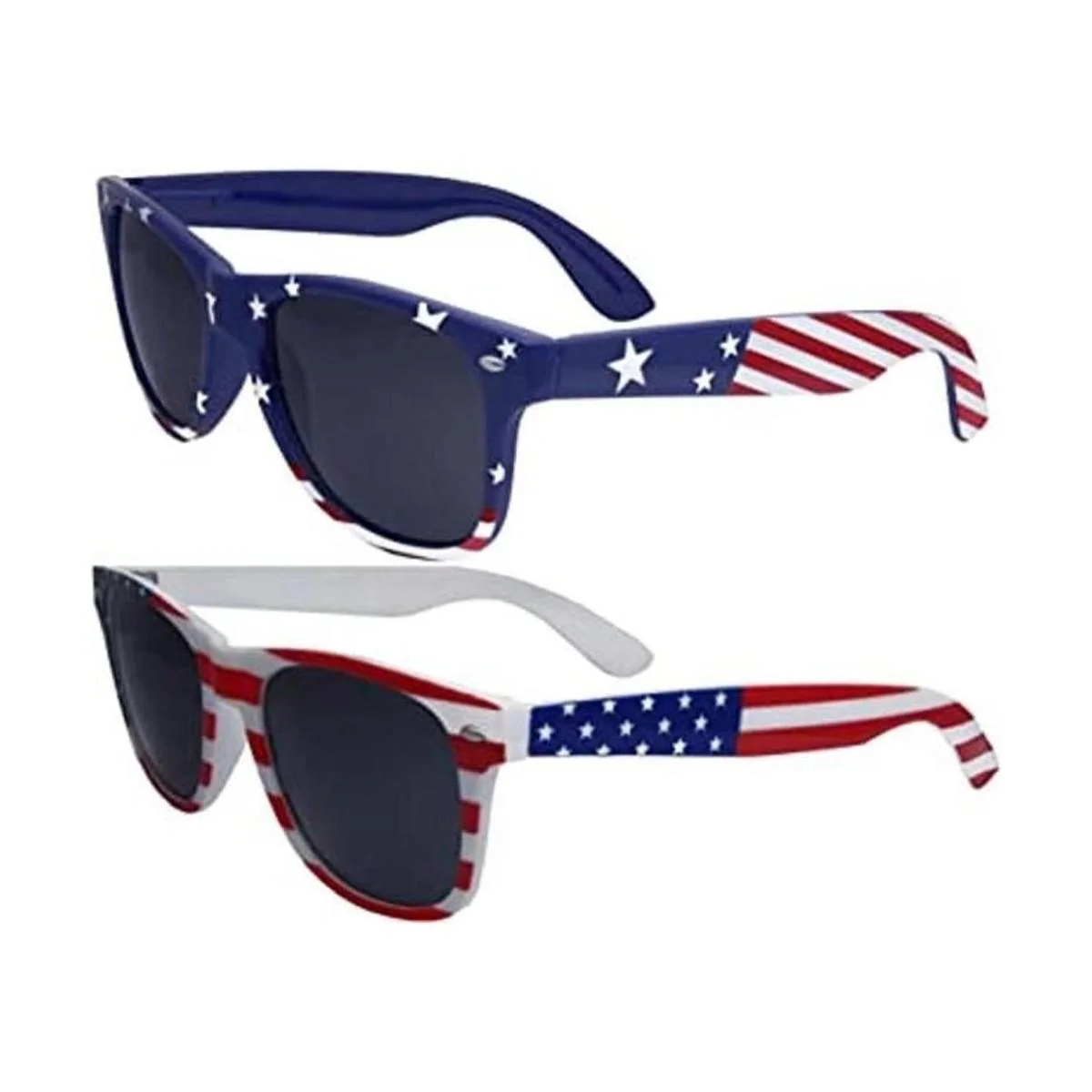 Obtén 2 gafas de sol en este paquete. Uno en estrellas azules y rayas, uno en rojo, blanco y azul