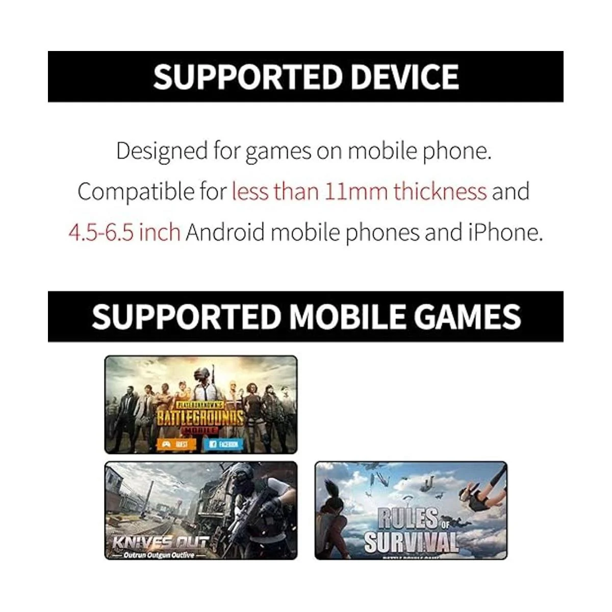 Dispositivo compatible: compatible con teléfonos iPhone y Android teléfono móvil de menos de 0.433 in de grosor con pantalla de 4.5 a 6.5 pulgadas, el teléfono se puede utilizar con un protector de pantalla y una funda de teléfono. Juegos compatibles: compatible con PUBG Mobile, Knives Out, Rules of Survival, Survivor Royale, Critical Ops y otros juegos móviles de disparo.