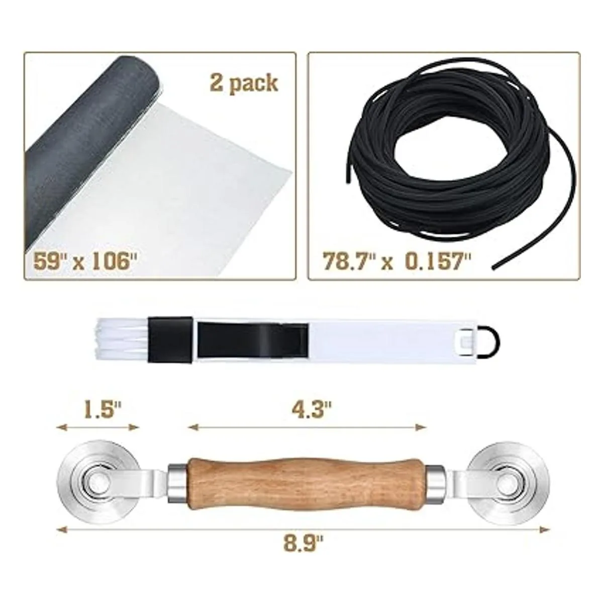 2 piezas 59 x 106 pantallas de ventana ajustables con herramienta de rodillo, férula de retención de pantalla, cepillo de limpieza para ventanas puertas patio