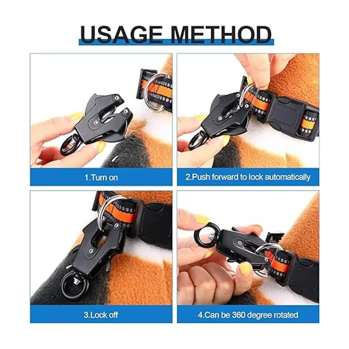 Cantidad suficiente: recibirás 2 clips de correa para perro, simples y prácticos, fáciles de sujetar y liberar, lo que te permite liberar fácilmente a tu perro en el parque o patio y dejar que juegue; la parte trasera tiene un anillo de metal que puede girar 360 grados, fácil instalación y libertad de movimiento