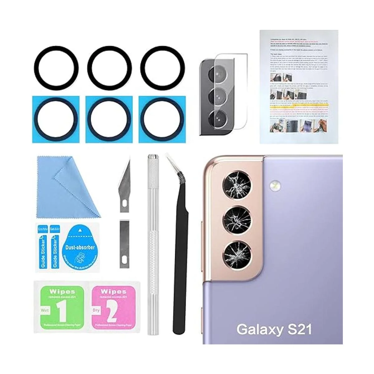 incluye manual de instalación paso a paso idioma español no garantizado. nuestro juego de reparación de cristal de lente de cámara samsung galaxy s21 viene con un detallado manual de instalación paso a paso para ayudarte a completar el proceso de reparación más rápido, reducir tu tiempo y aumentar la posibilidad de tener un reemplazo de lente exitoso. también tenemos 24 horas de personal postventa en línea para ayudarle en cualquier momento. en lugar de permitirte ir a para buscar y ver el vídeo, porque insistimos en hacer más por nuestros clientes