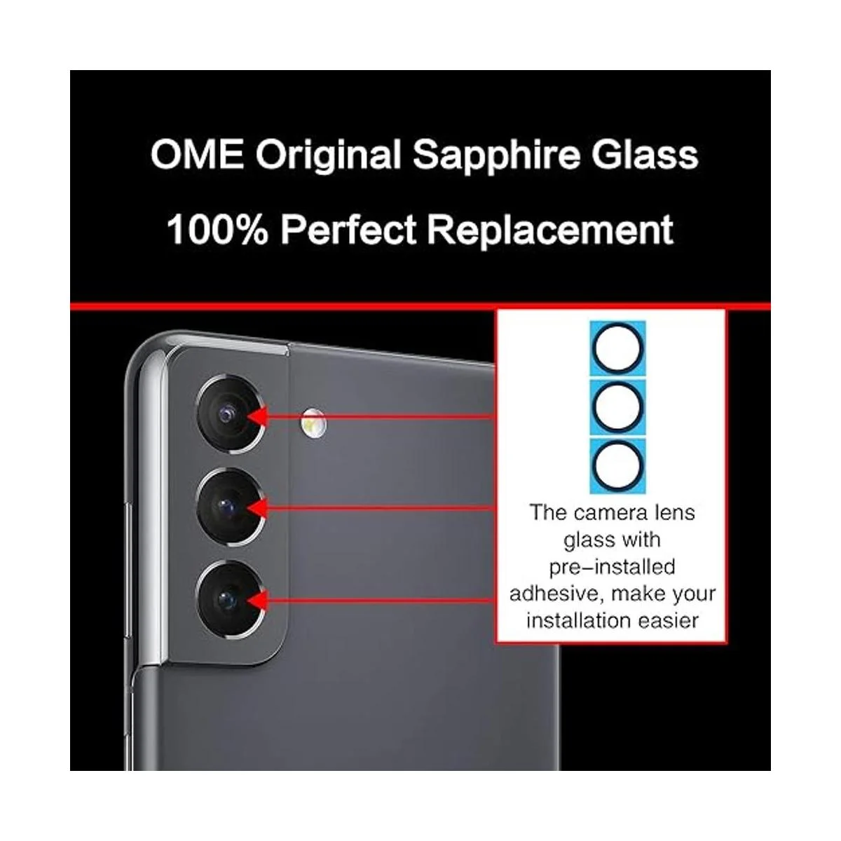 2 unidades de lentes de cámara oem 100 ajuste usted puede obtener 2 unidades por el precio de 1 paquete. hay un cristal de cámara de repuesto en caso de accidente. 100 ajuste perfecto original de repuesto de cristal de cámara trasera para samsung galaxy s21 todos los operadores. no para galaxy s21 ultra. precisamente el mismo que el cristal de tu cámara samsung galaxy s21 oem. viene con adhesivo original de doble cara que asegura que el nuevo cristal de la lente no se caiga. no te preocupes por el desbordamiento de pegamento y afecta a la apariencia