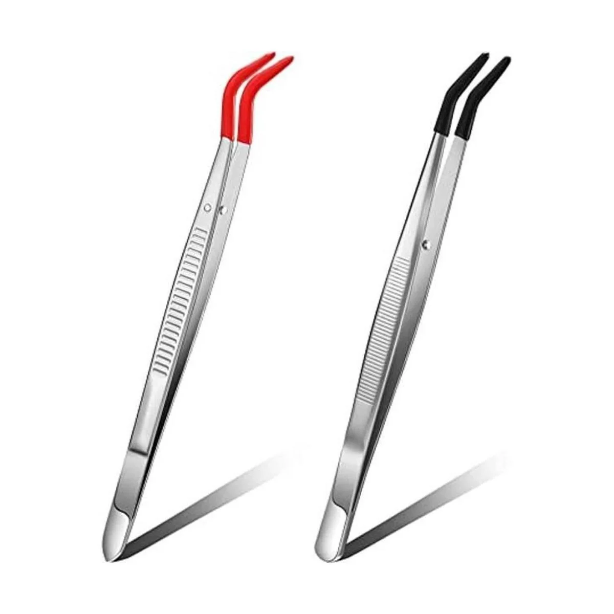 2 pinzas curvadas de punta doblada con puntas de silicona de goma, con revestimiento de PVC, no se estropean, pinzas de goma largas y suaves, de acero inoxidable, herramientas de manualidades para fabricación de joyas de laboratorio, color rojo y negro