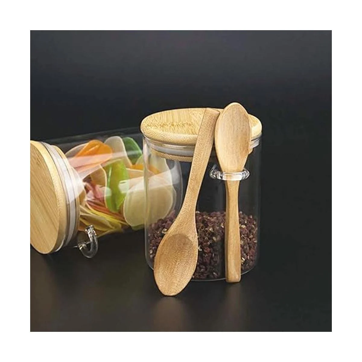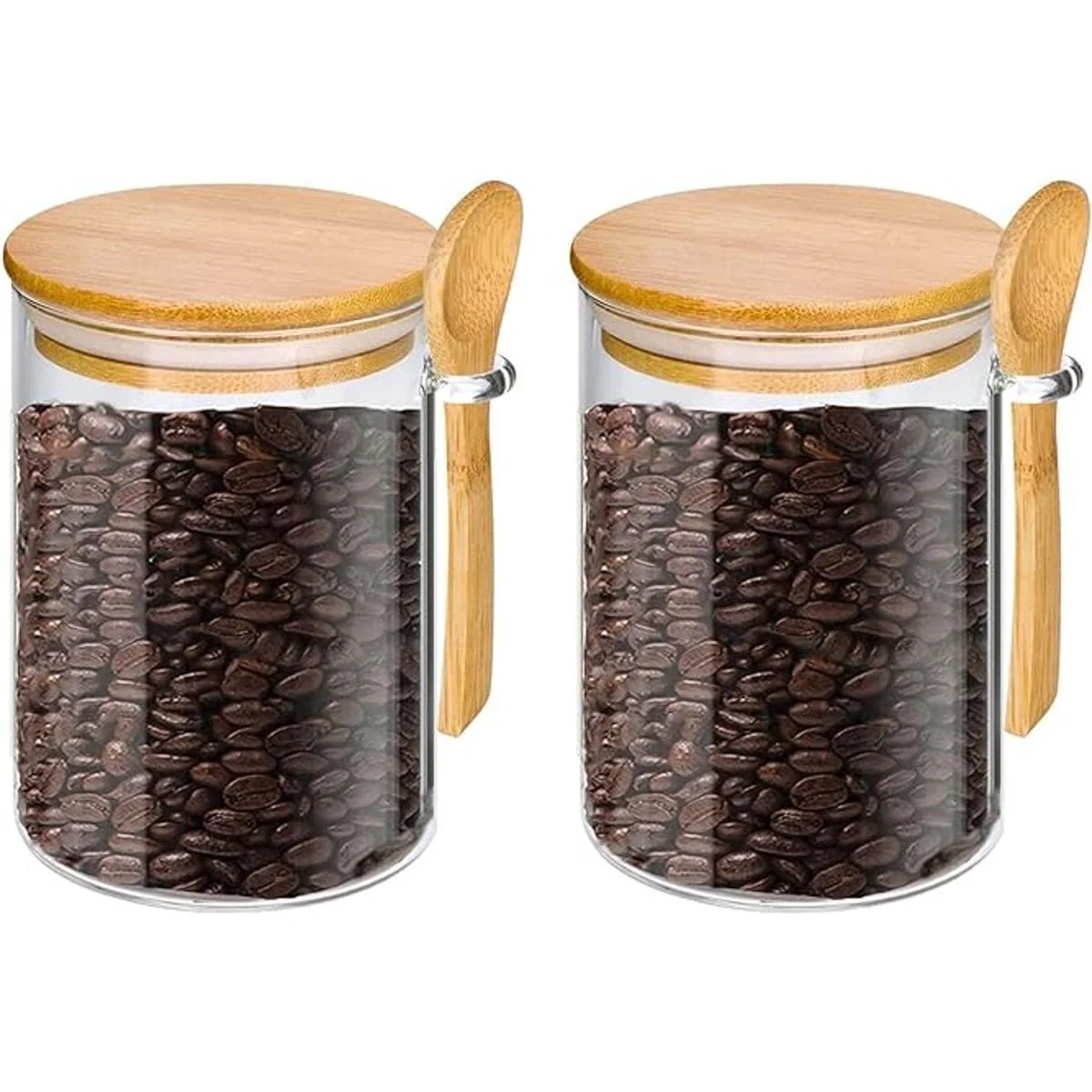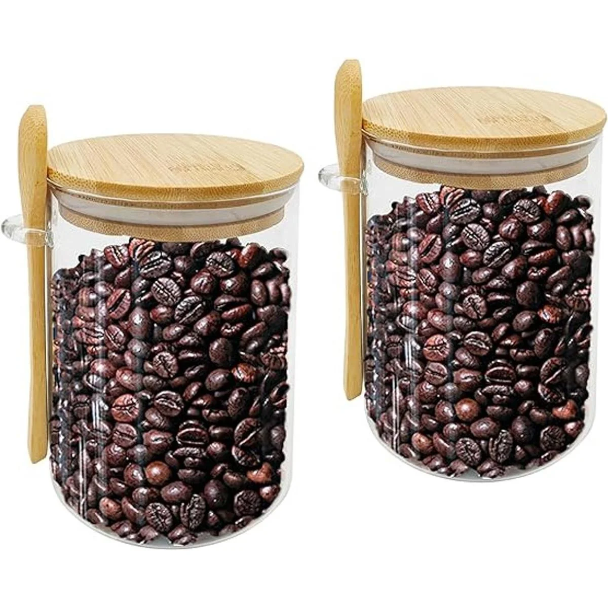 2 recipientes de vidrio de 17 onzas con tapa hermética de bambú y cuchara, juego de recipientes apilables de almacenamiento de alimentos de vidrio para organización de cocina para caramelos, especias, azúcar, café, frutos secos 2