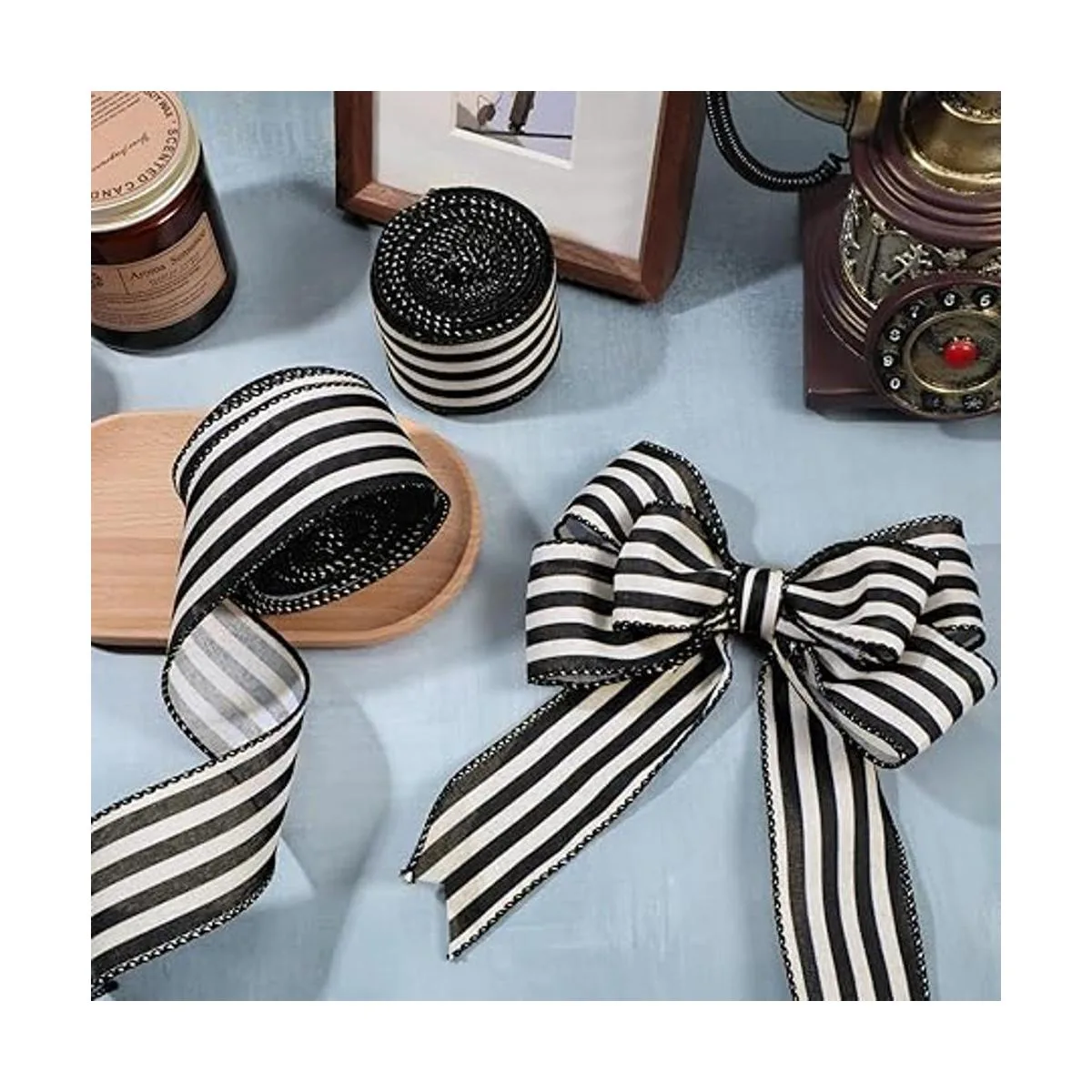 Cintas marfil y negro: el paquete viene con 2 rollos de cintas con bordes de alambre, diseñadas con rayas marfil y negras, clásico pero delicado, suficiente para decorar bodas, fiestas y vacaciones, para que sean atractivos e inolvidables