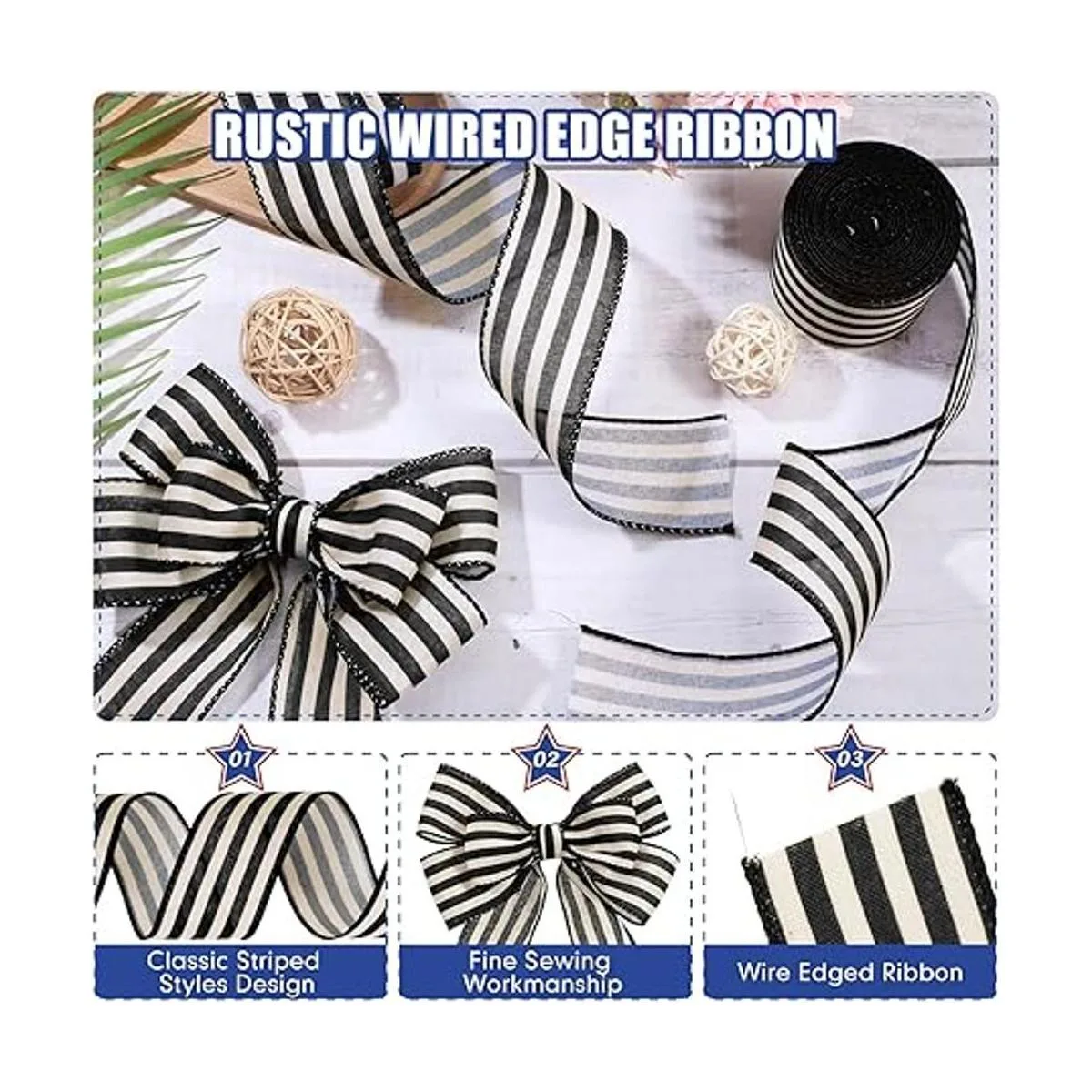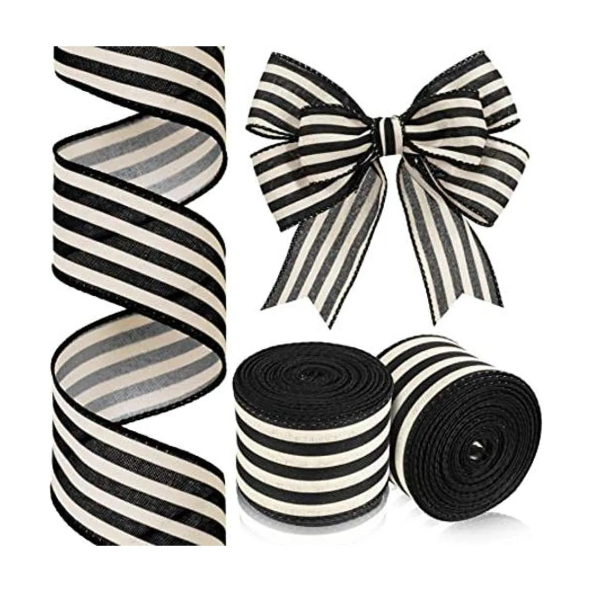 2 rollos de 20 yardas de rayas blancas y negras con borde con alambre, cinta rústica de marfil, cinta bohemia para manualidades, decoración del hogar, envoltura de regalos, corona, Navidad, boda, fiesta 2 pulgadas