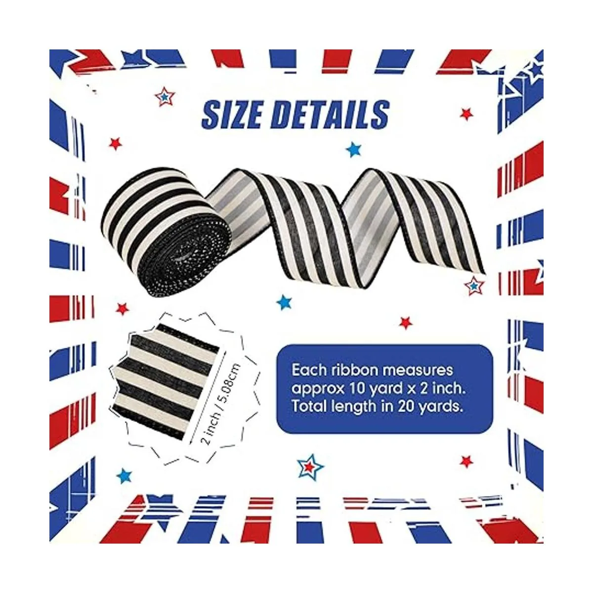 Detalles del tamaño: la cinta a rayas es de aproximadamente 10 yardas de largo y 2 pulgadas de ancho, 20 yardas de largo en total 2 rollos, lo que te permite cortarlas en la longitud correcta de acuerdo a tus regalos, lo que puede satisfacer tus diferentes necesidades de decoración y manualidades