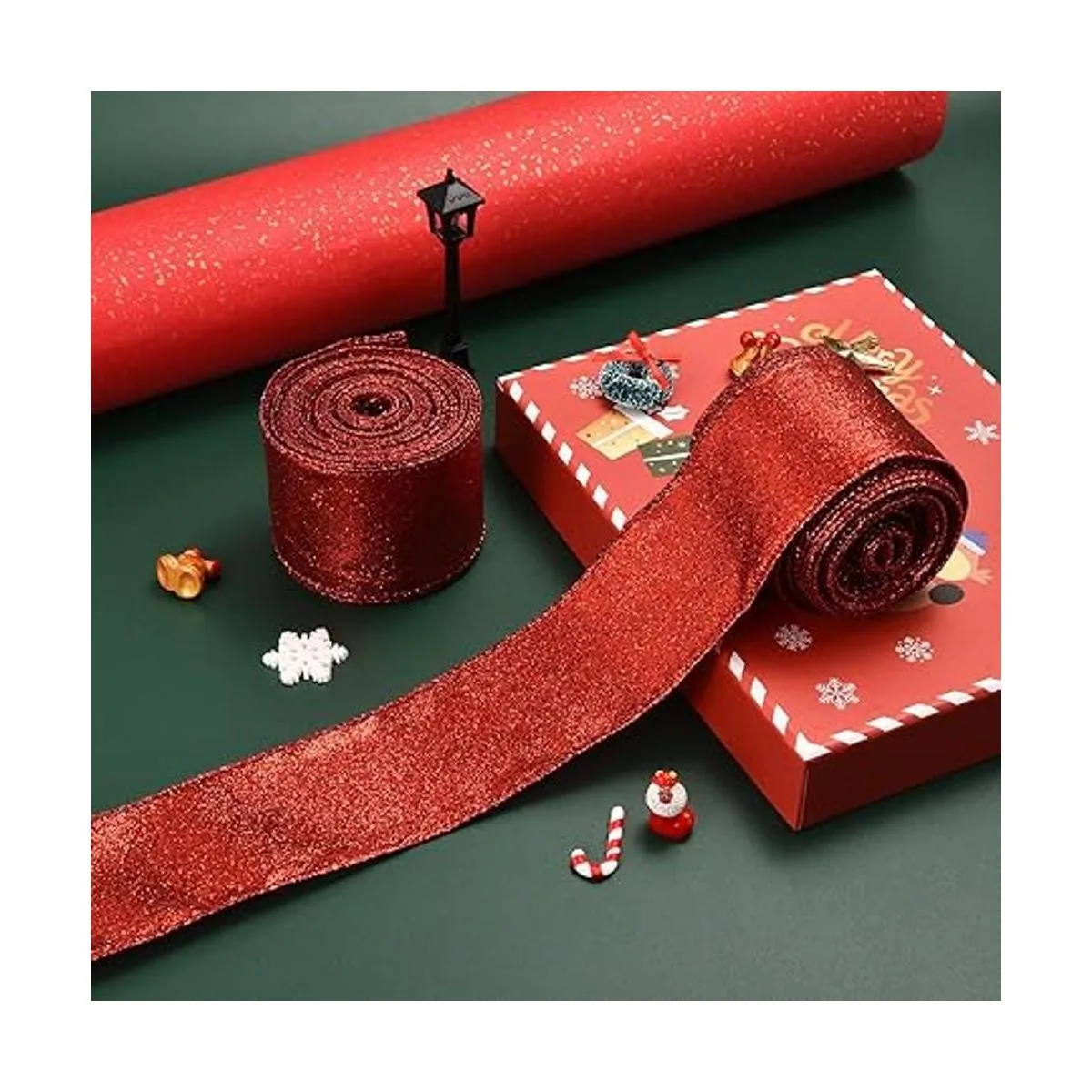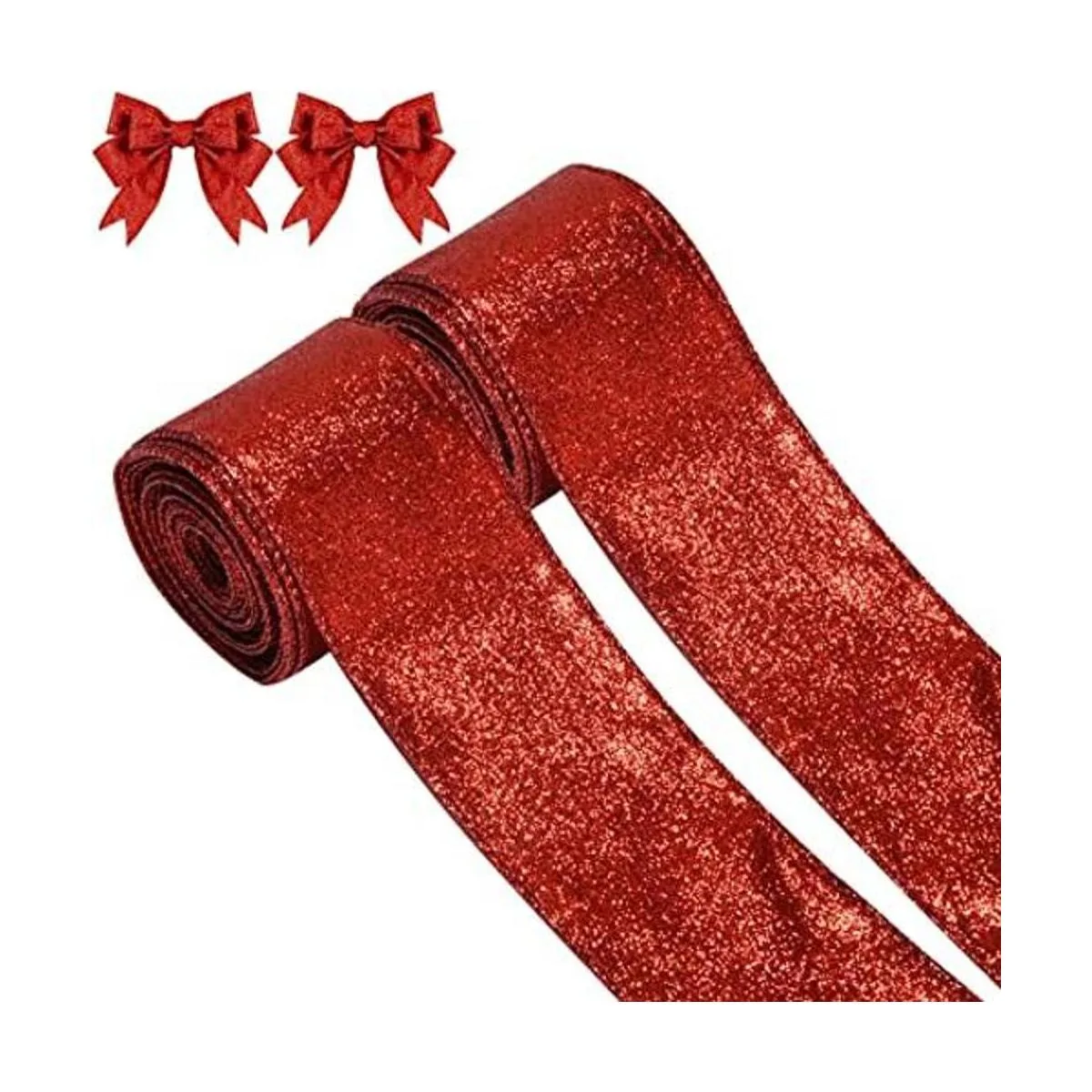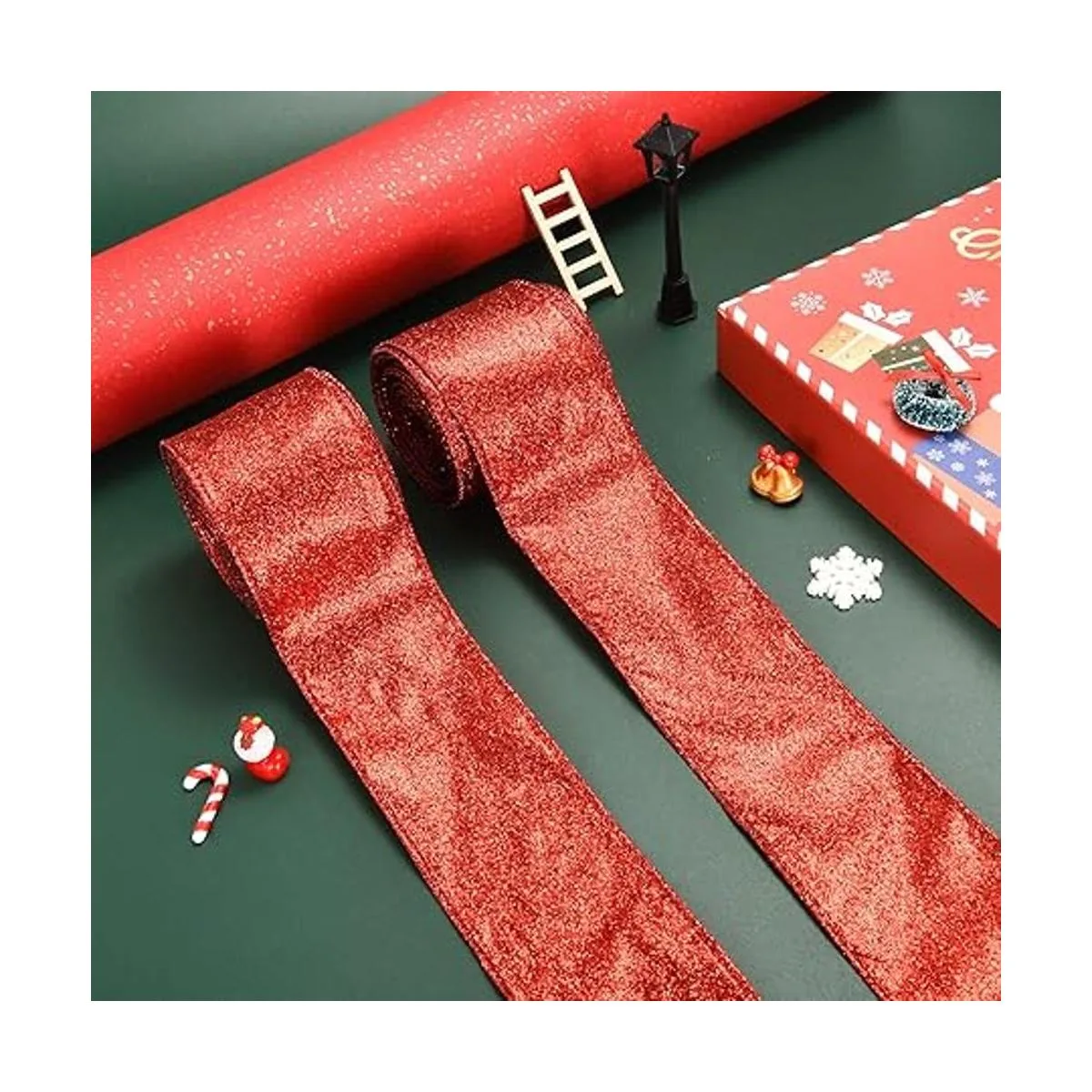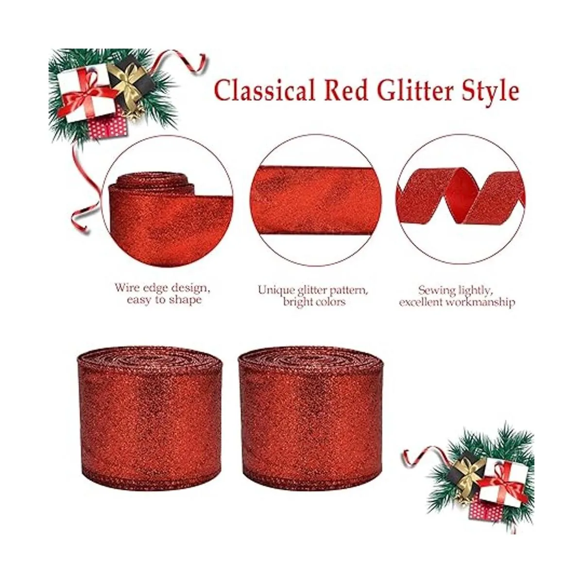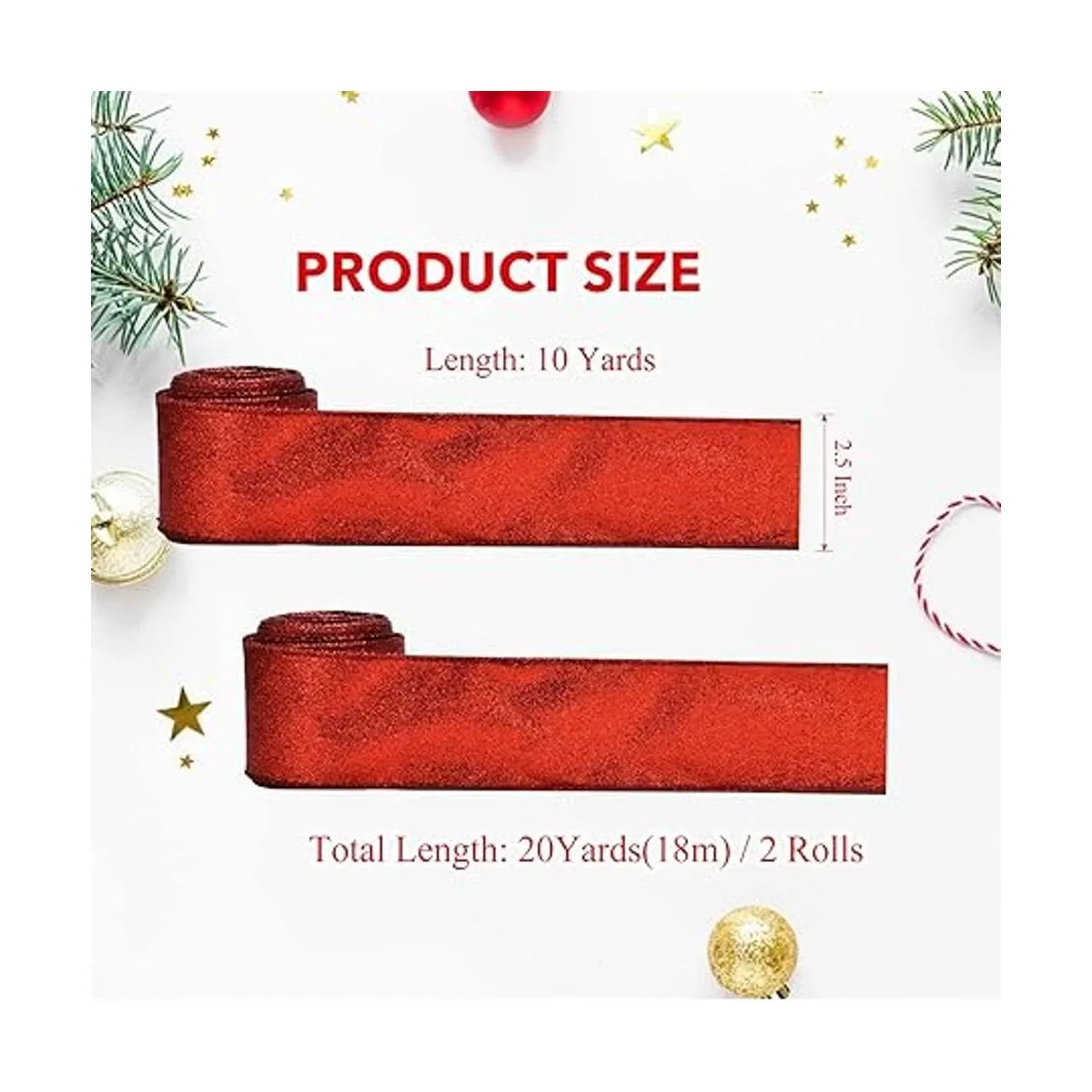2 rollos de cinta de Navidad de 20 yardas, cinta metálica con purpurina para envolver regalos, cinta roja brillante con borde con alambre para coronas de árbol de Navidad, manualidades, decoración de fiestas en casa, 2.5 pulgadas x 10 yardas x 2