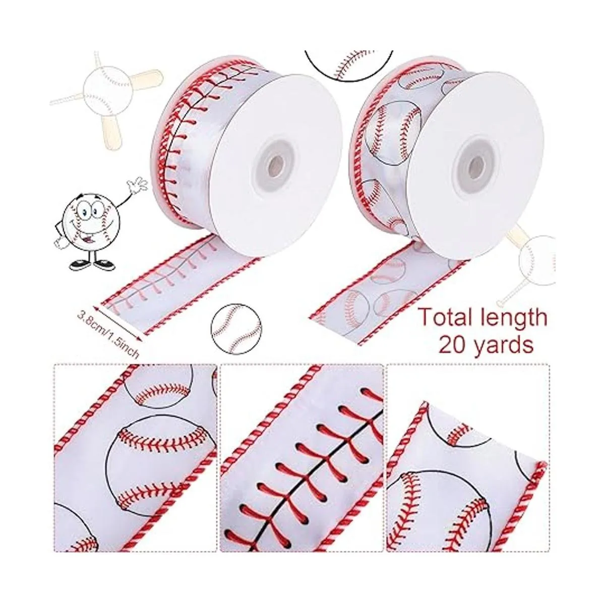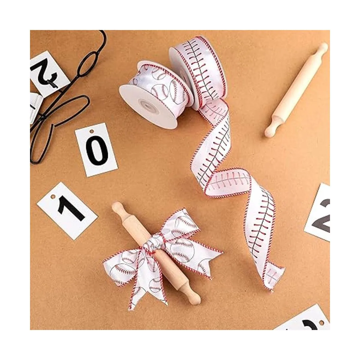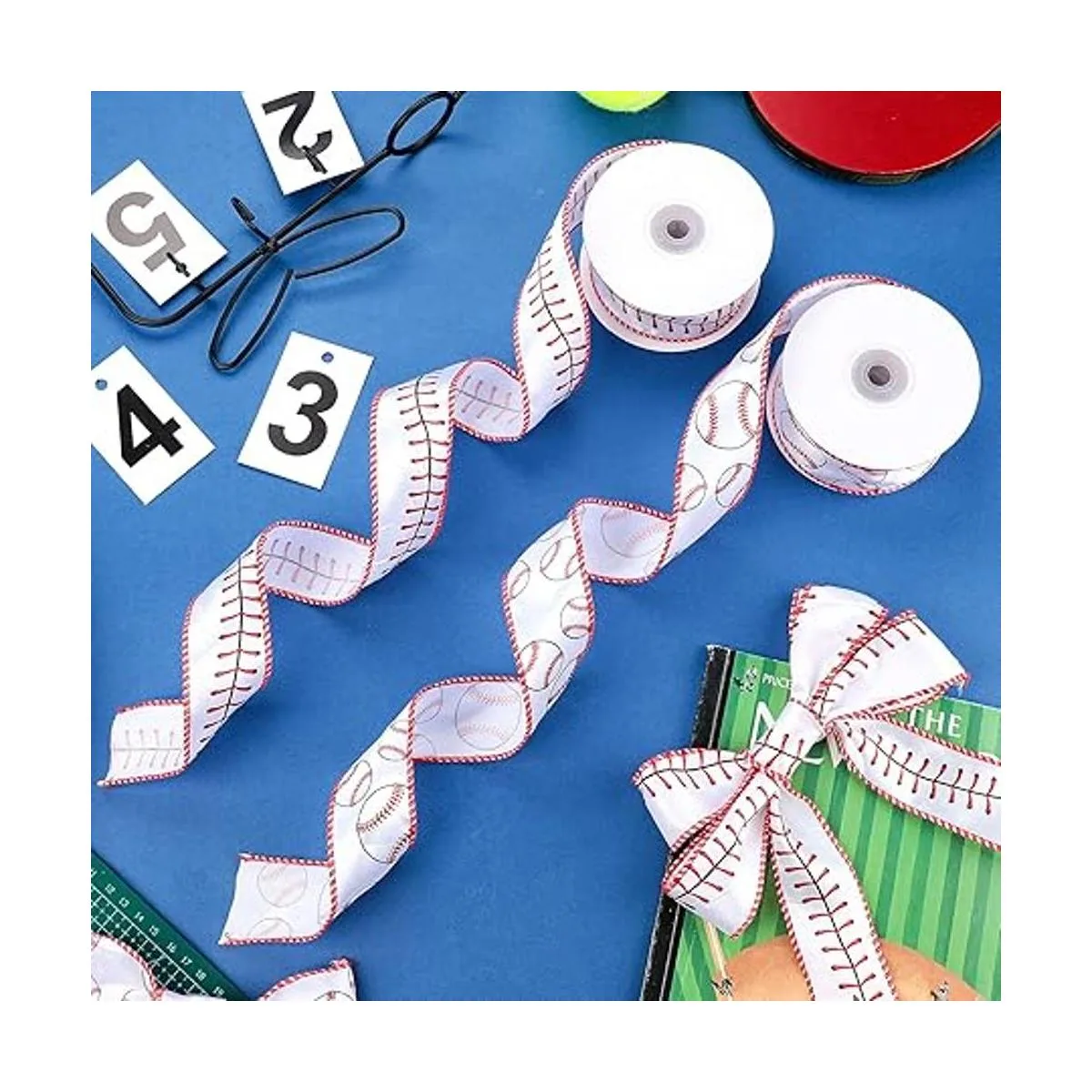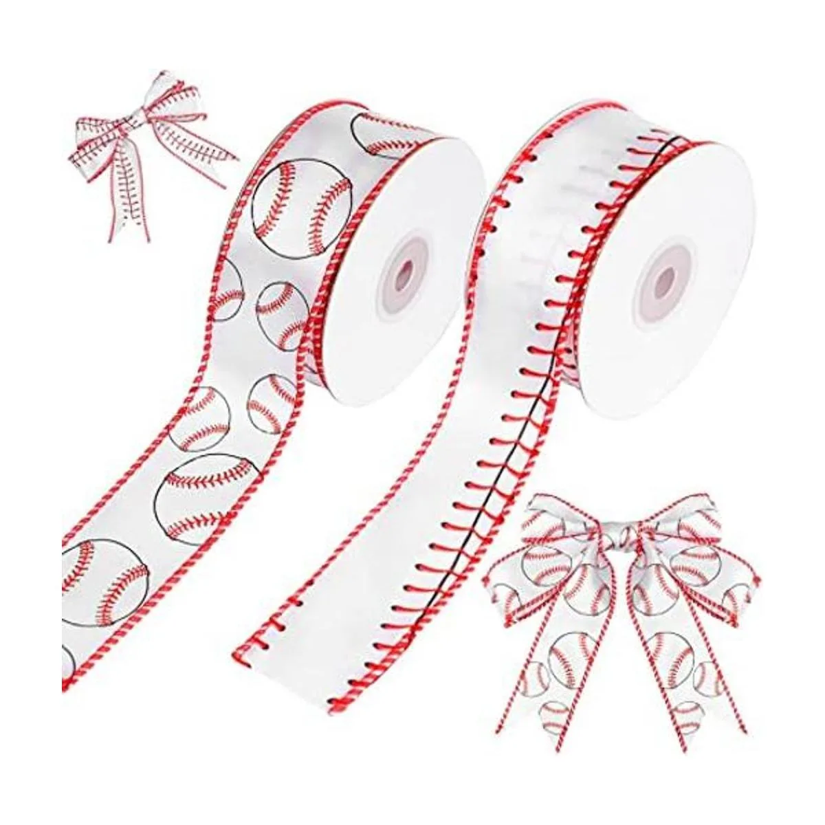 2 rollos de cintas de béisbol rojo y blanco con borde de alambre de cinta de tela de 1.4 in x 8.2 ft de costura deportiva de satén con alambre de cinta para envolver regalos DIY manualidades decoración
