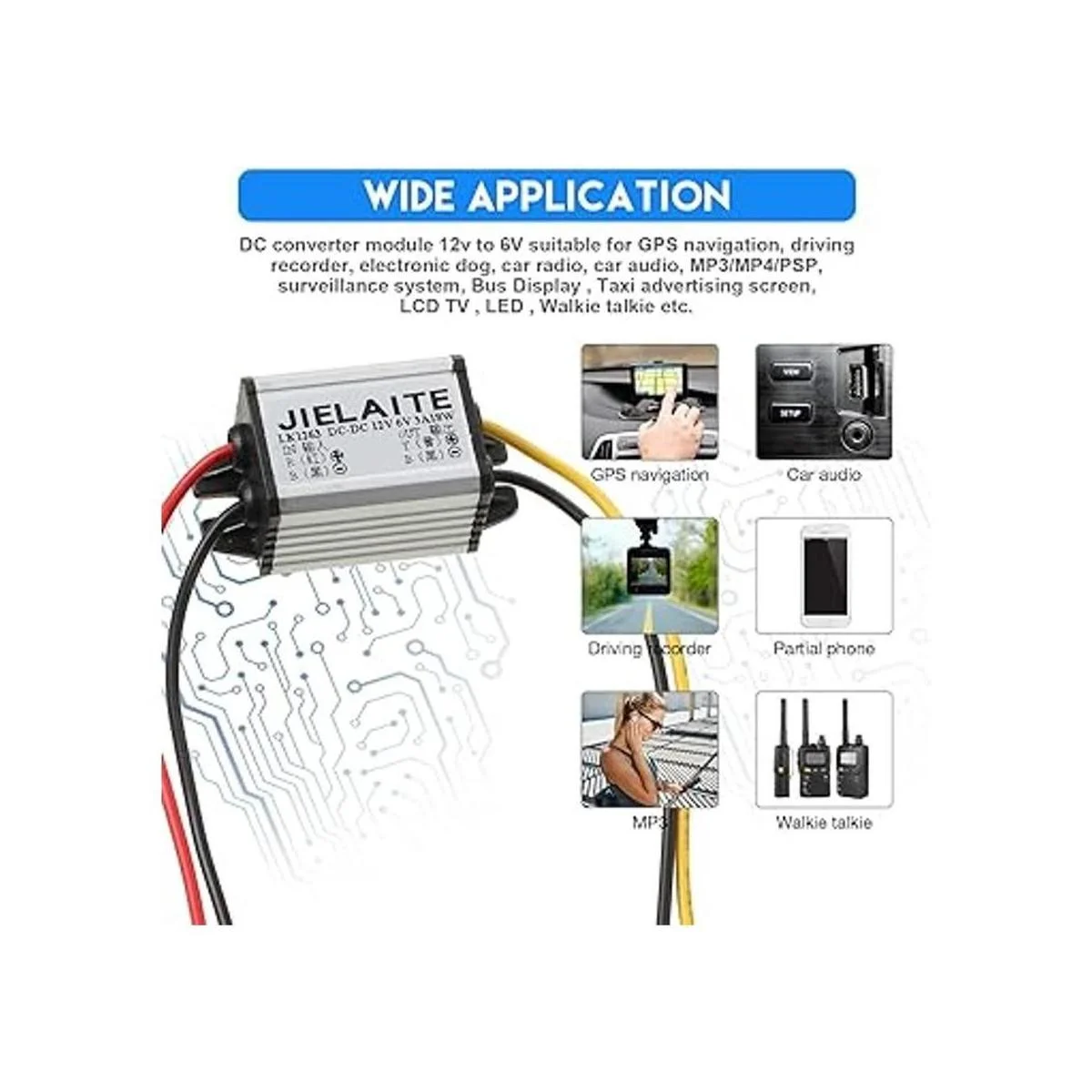 Múltiples usos: el módulo convertidor de CC de 12 V a 6 V es adecuado para navegación GPS, grabadora de conducción, perro electrónico, radio de coche, audio de coche, MP3/MP4, walkie talkie, sistema de vigilancia, pantalla de autobús, pantalla de publicidad de taxi, grabadora de conducción, TV LCD, LED, etc.