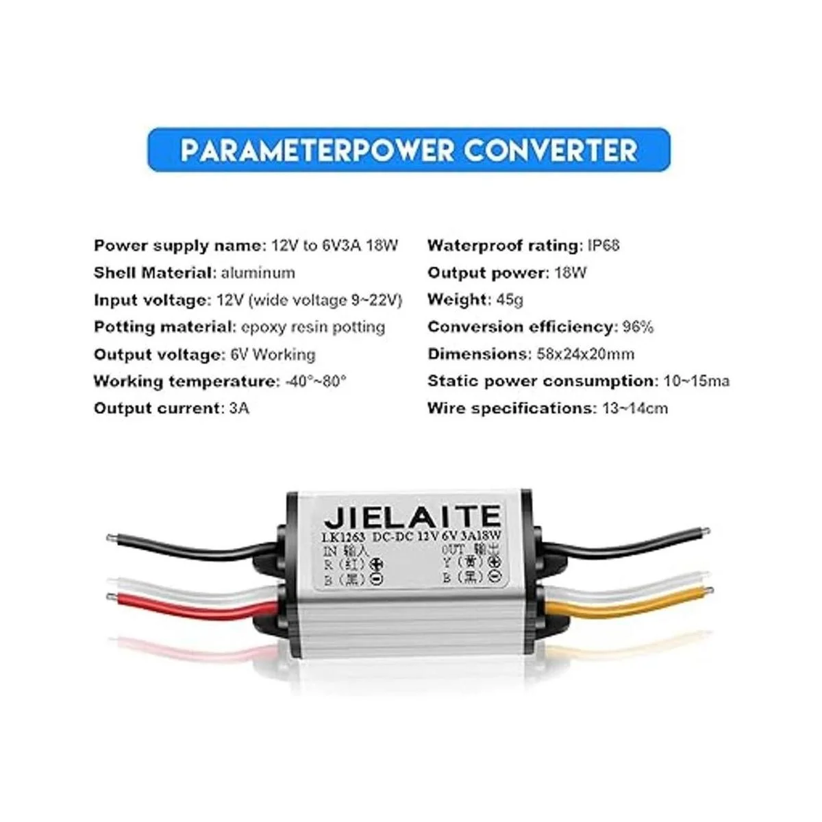 Convertidor reductor de CC 12 V a CC 6 V: voltaje de entrada: CC 12 V entrada de amplio rango de 8 a 22 V; voltaje de salida: 6 V; corriente sin carga: 10 a 15 mA; corriente de salida: 3 A máx.; potencia de salida: 18 W máx.