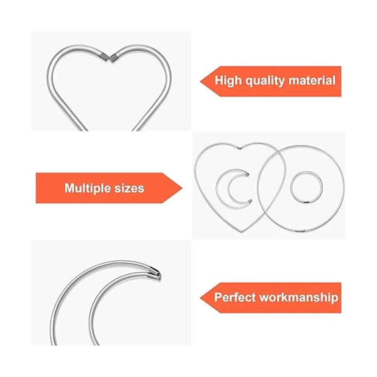 Diferentes formas: hay 20 anillos de metal en total, incluyendo 6 piezas en forma de luna, 6 piezas en forma de corazón y 8 piezas en forma de círculo, puedes elegir diferentes formas de nuestros anillos de metal para hacerlo tú mismo, o combinar algunos de ellos juntos de acuerdo a tus preferencias e ideas