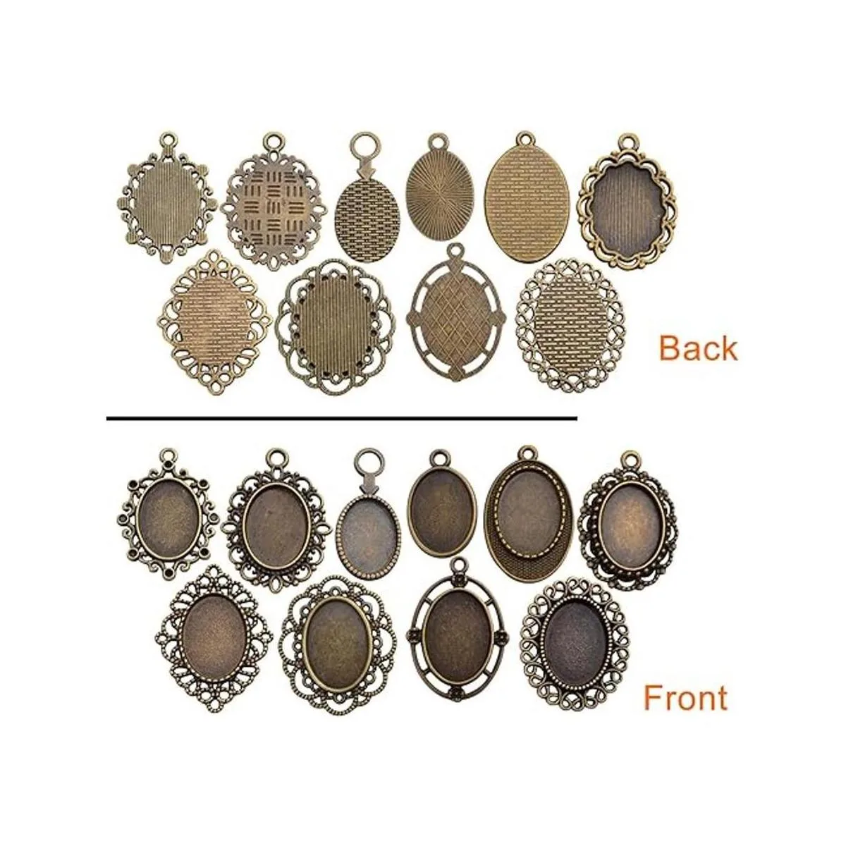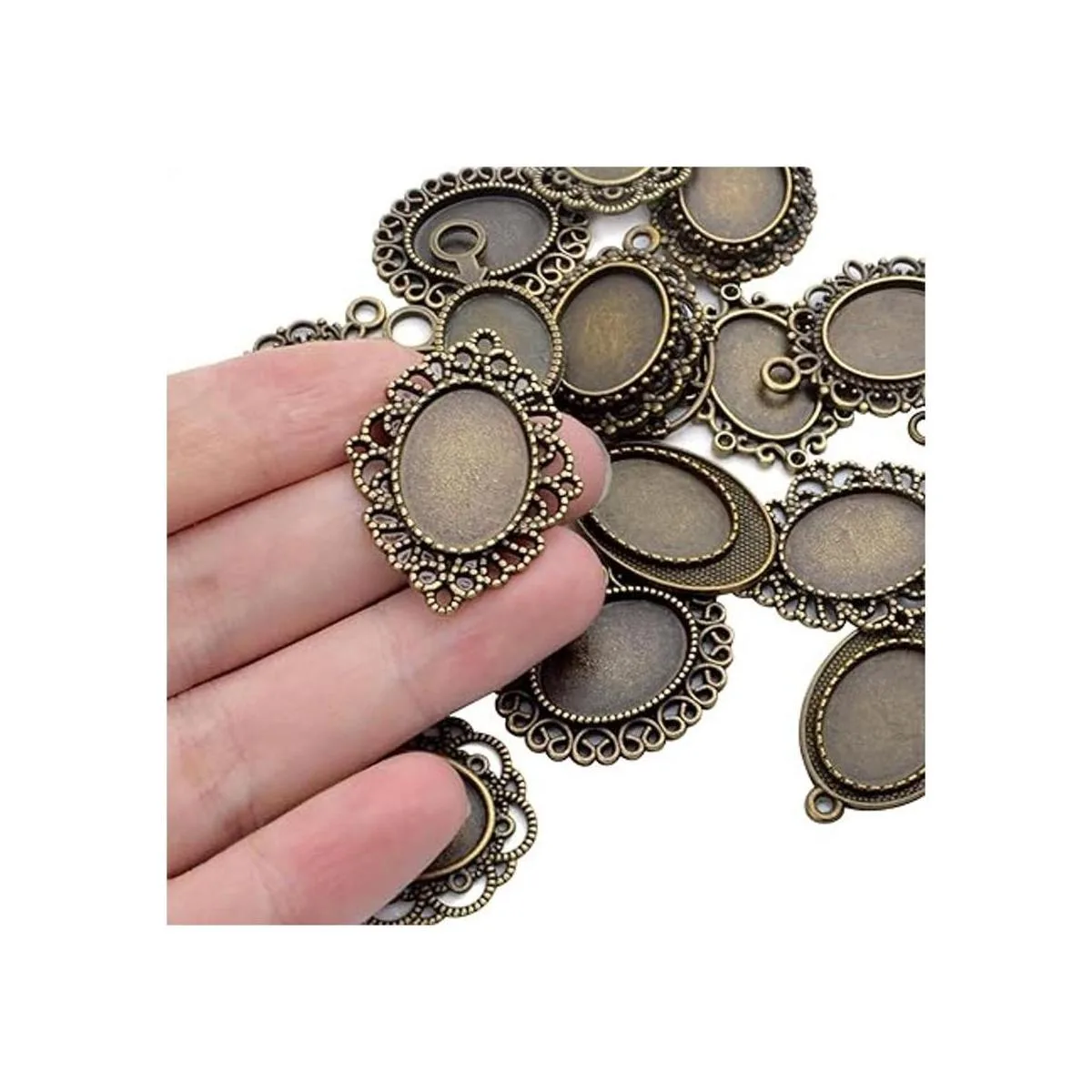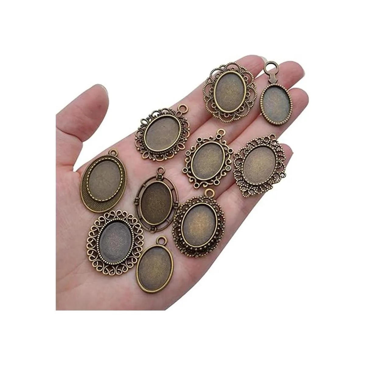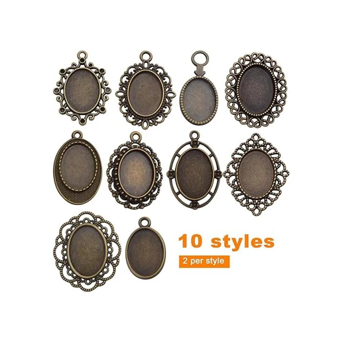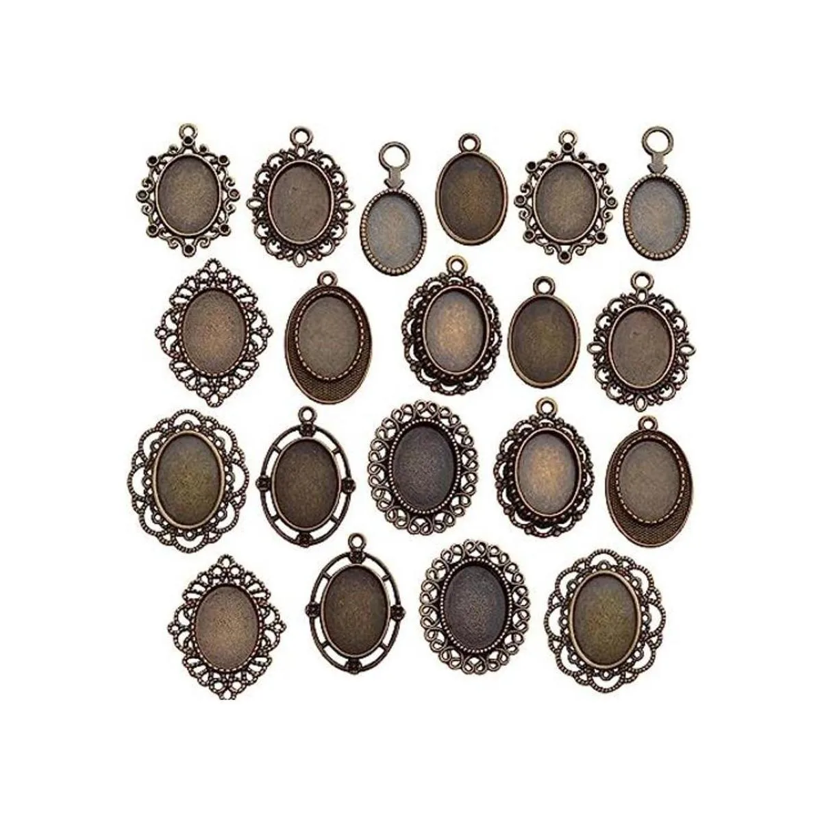 20 bandejas colgantes de bisel, 0.512 x 0.709 in, ovaladas para colgar en biseles, cabujón con configuración de bandejas para colgar en blanco para hacer joyas de bricolaje 10 estilos, bronce antiguo