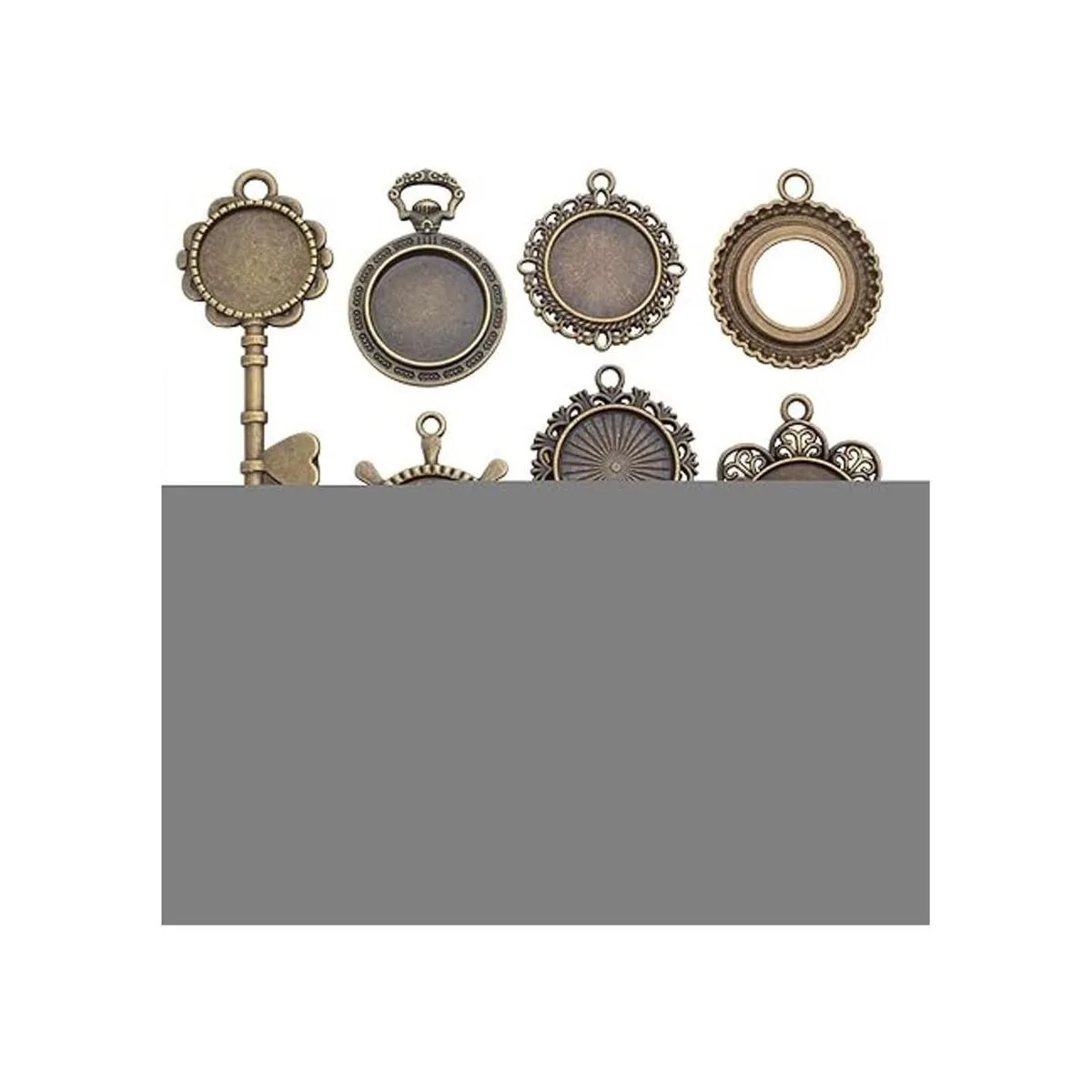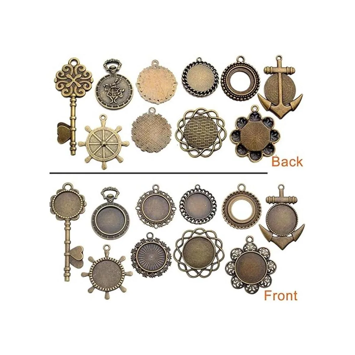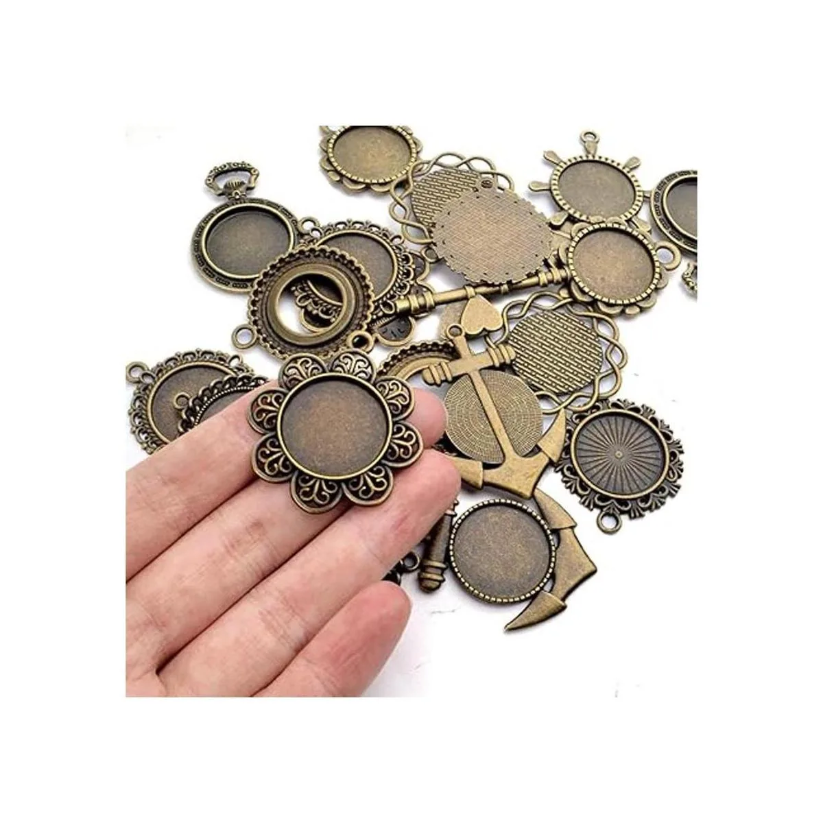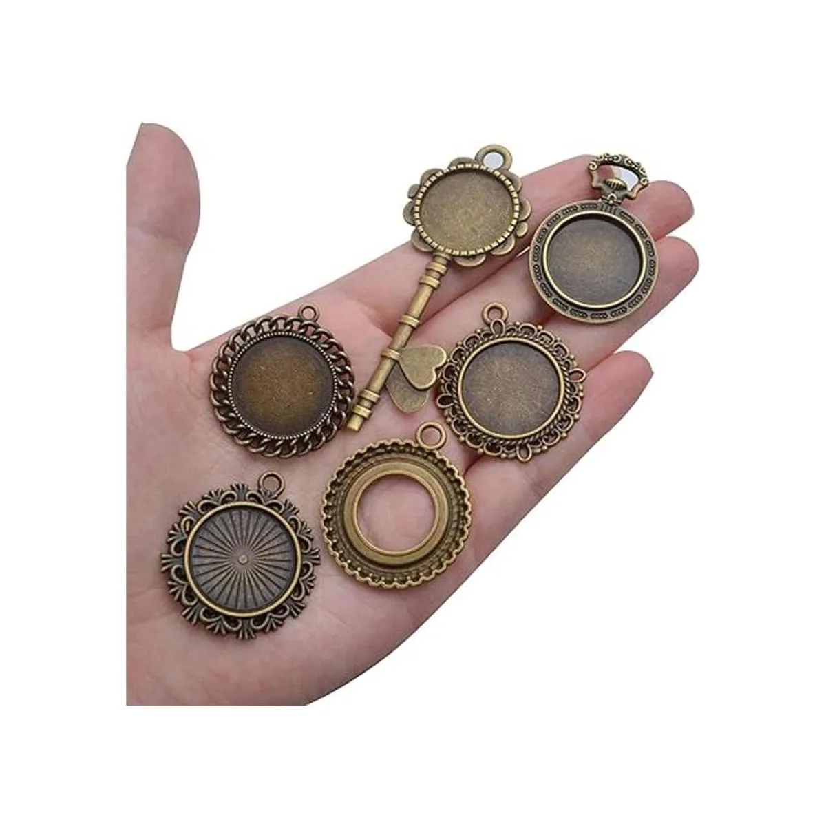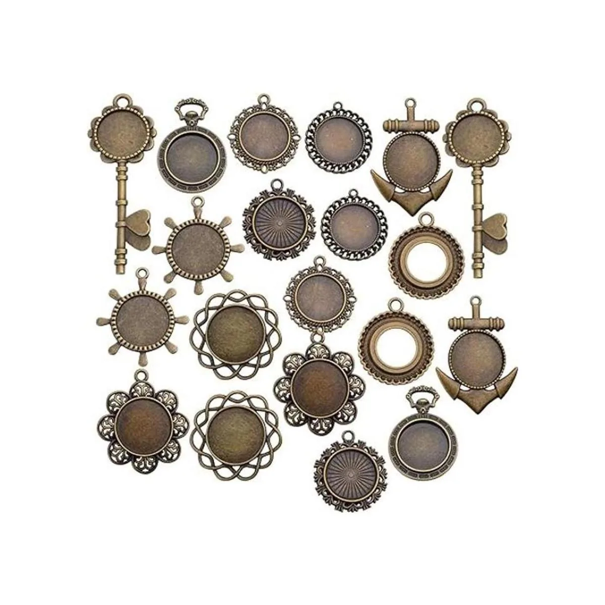 Contenido del paquete: recibirás 20 bandejas redondas para colgantes de 10 estilos diferentes, 2 piezas de cada estilo.