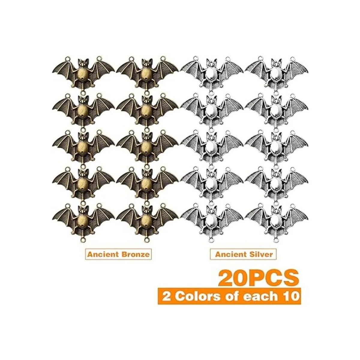 El paquete incluye: recibirás 20 abalorios de murciélago en total, 2 colores plata antigua y bronce antiguo, 10 unidades de cada color; el tamaño es de 1.874 in de largo, 1.181 in de ancho, el agujero del colgante: 0.094 in.