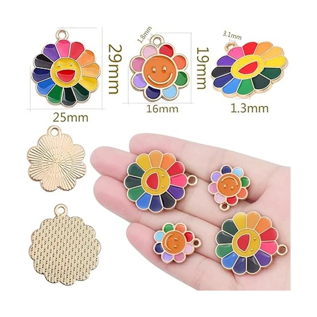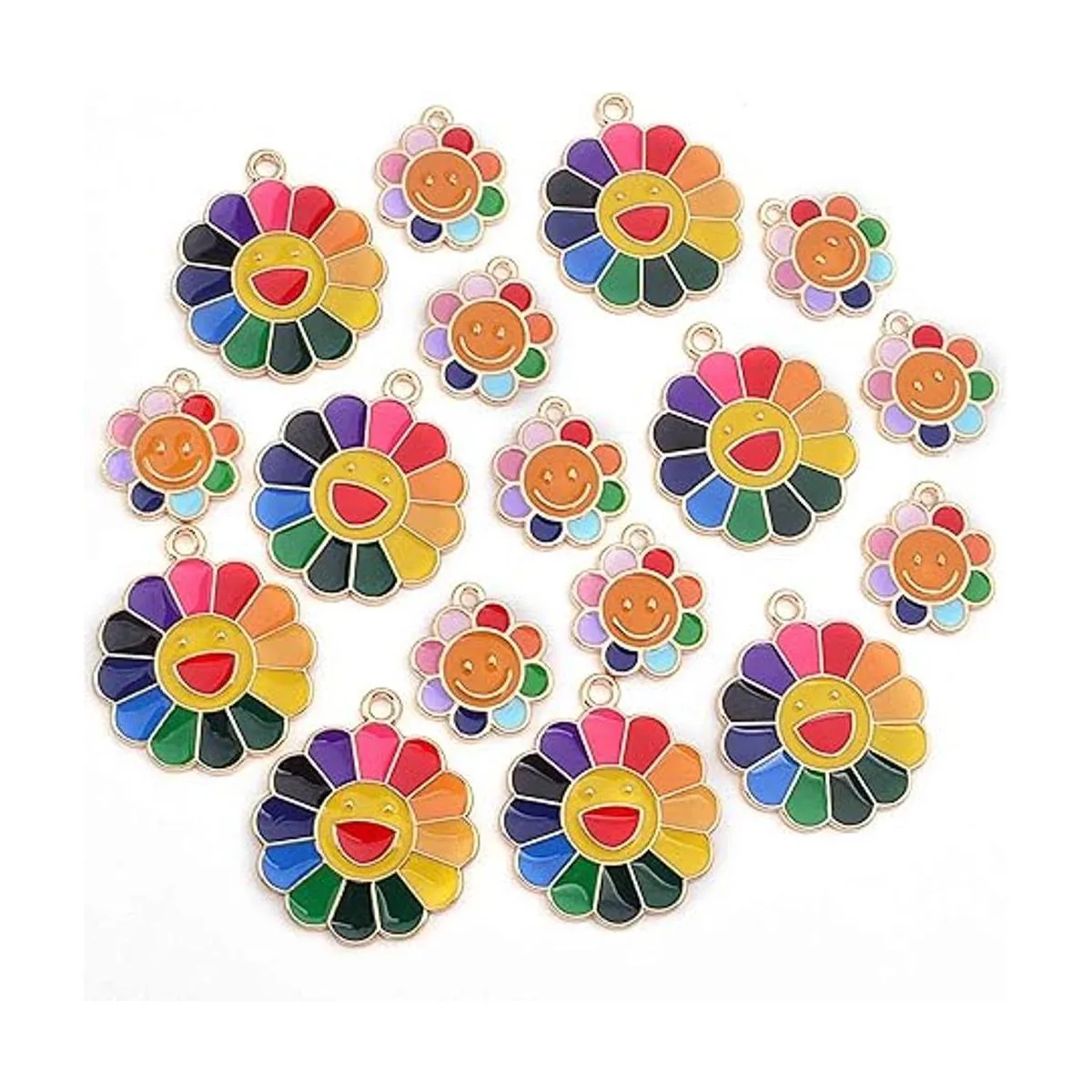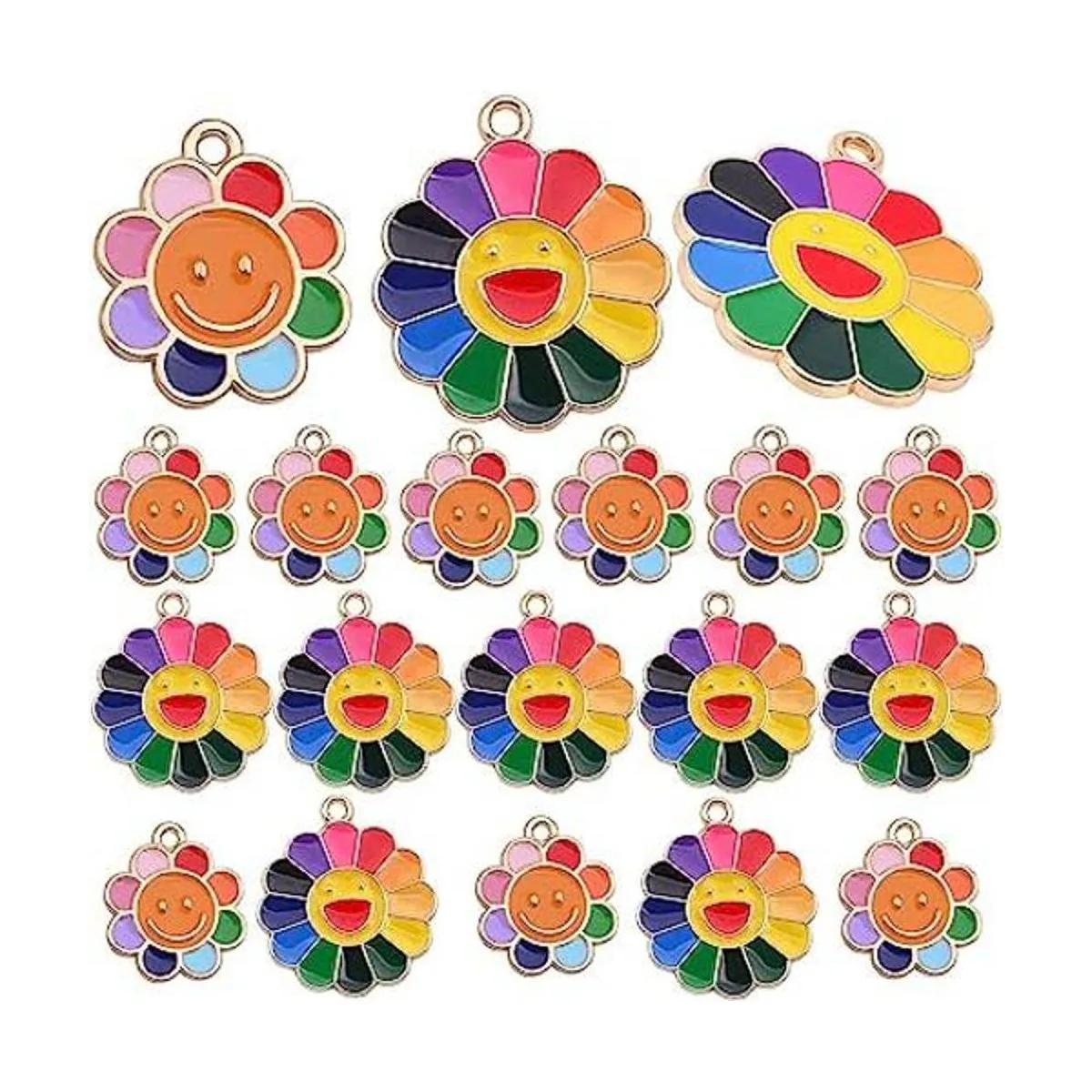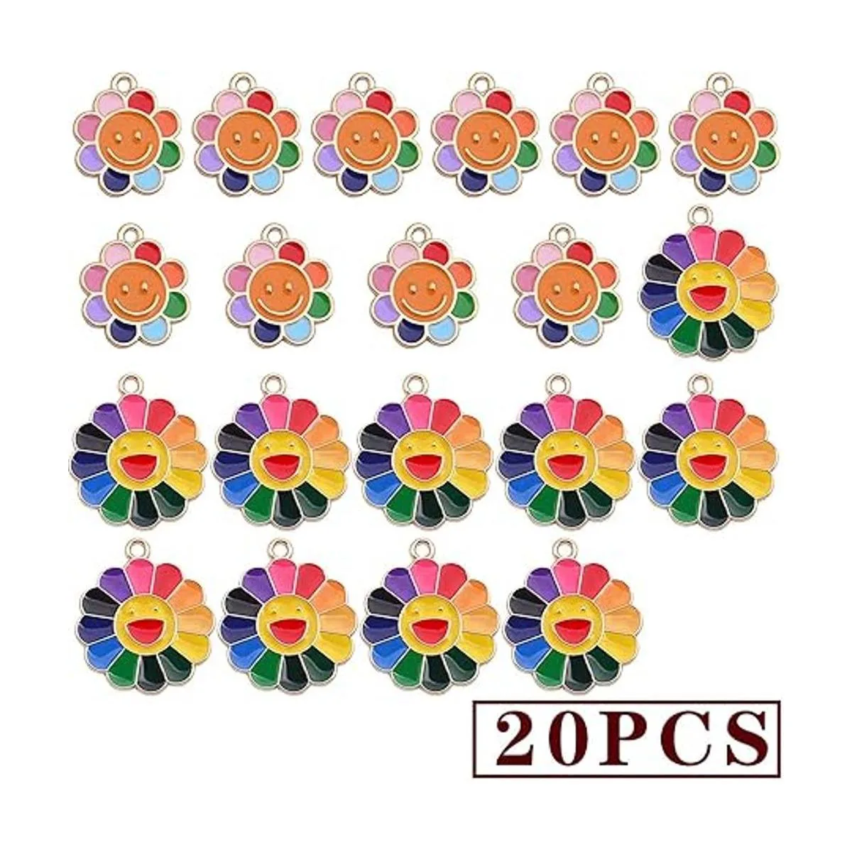 El paquete incluye: el paquete viene con 20 dijes de girasol sonriente esmaltados coloridos en 2 tamaños, 10 piezas para cada tamaño. Cantidad suficiente y diferentes tamaños pueden satisfacer tus diversas demandas de joyería.