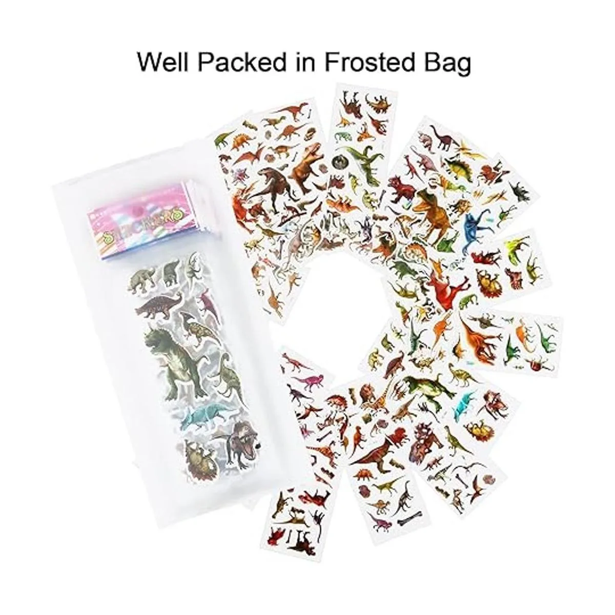 Bien empaquetado Cada bonita hoja de calcomanías de dinosaurio está empaquetada individualmente en su propio plástico. Mantiene la limpieza y fácil de poner en las bolsas de golosinas o bolsas de papel, juguetes perfectos para fiestas de dinosaurios para niños de 3 a 8 años y decoraciones de fiesta de dinosaurios.