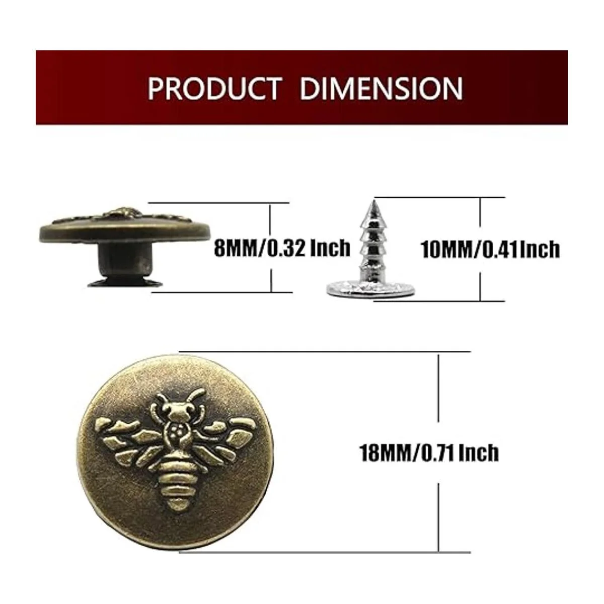 Dimensiones: tamaño de la tapa 0.71 x 0.71 x 0.32 pulgadas, tamaño del remache 0.28 x 0.28 x 0.39 pulgadas, cada juego se compone de 1 botón de tapa y 1 remache