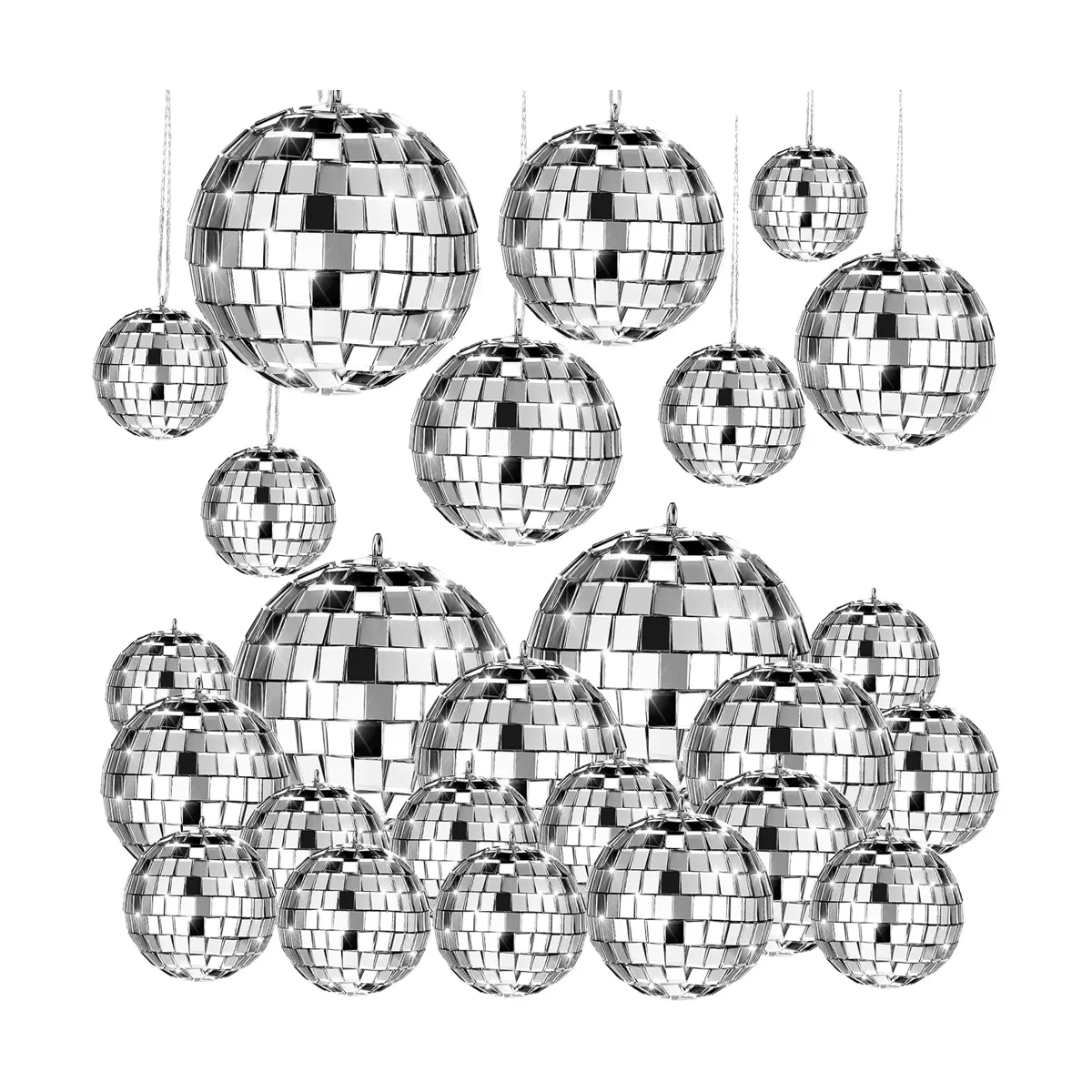 20 piezas de espejo colgante bola de discoteca de cristal, mini bola de discoteca plateada, decoración de discoteca brillante, decoración de fiesta navideña con cuerda 2.4 pulgadas, 2 pulgadas, 1.6 pulgadas, 1.2 pulgadas