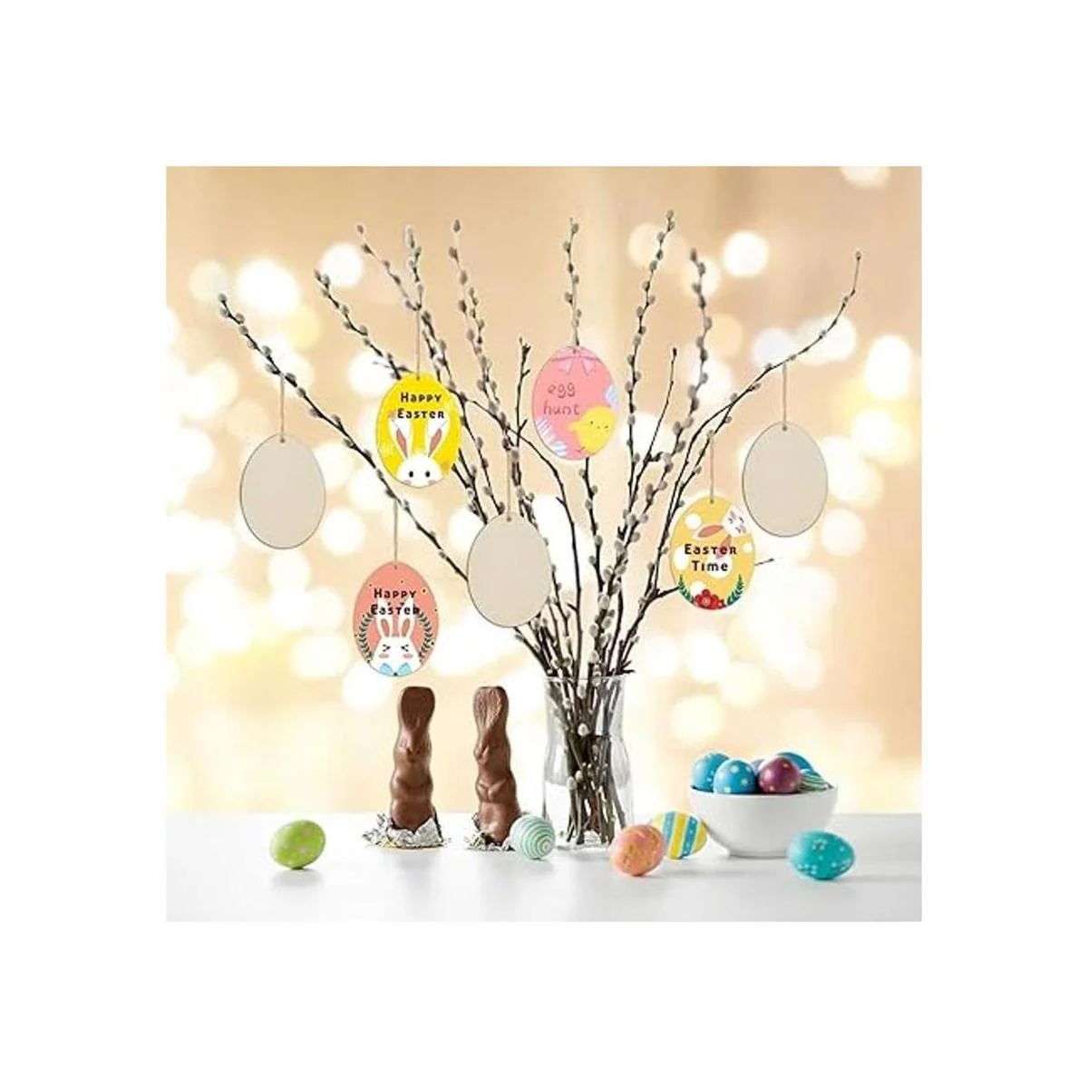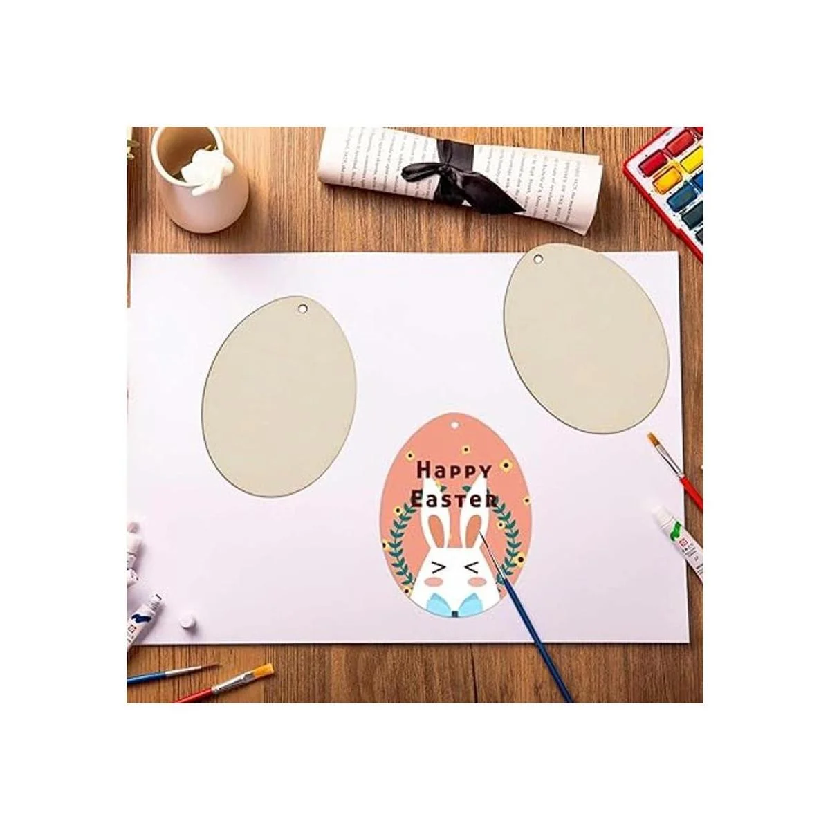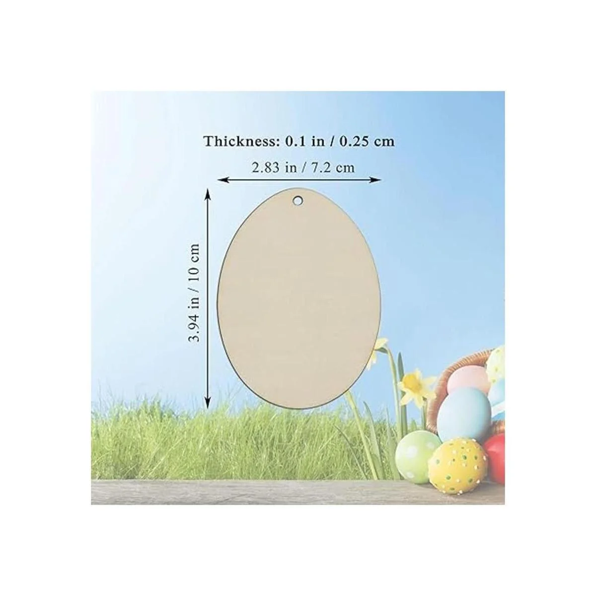 Características: adornos colgantes de madera en forma de huevo en blanco, con un agujero y cuerda, se puede utilizar para colgar decoración. Perfecto para usar como etiquetas, tablero de fiesta, tablero de aula.