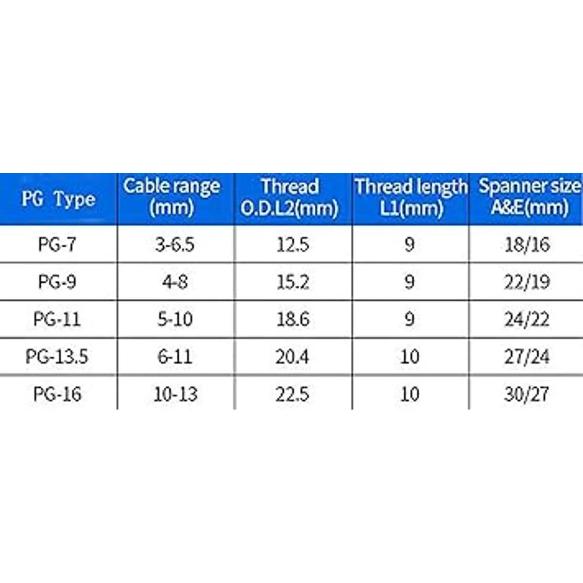 Diámetro exterior de la rosca: : PG7 0,49 pulgadas, PG9 0,6 pulgadas, PG11 0,73 pulgadas, PG13,5 0,81 pulgadas, PG16 0,89 pulgadas. Longitud mínima de la rosca: 0.35 pulgadas, longitud máxima: 0.4 pulgadas