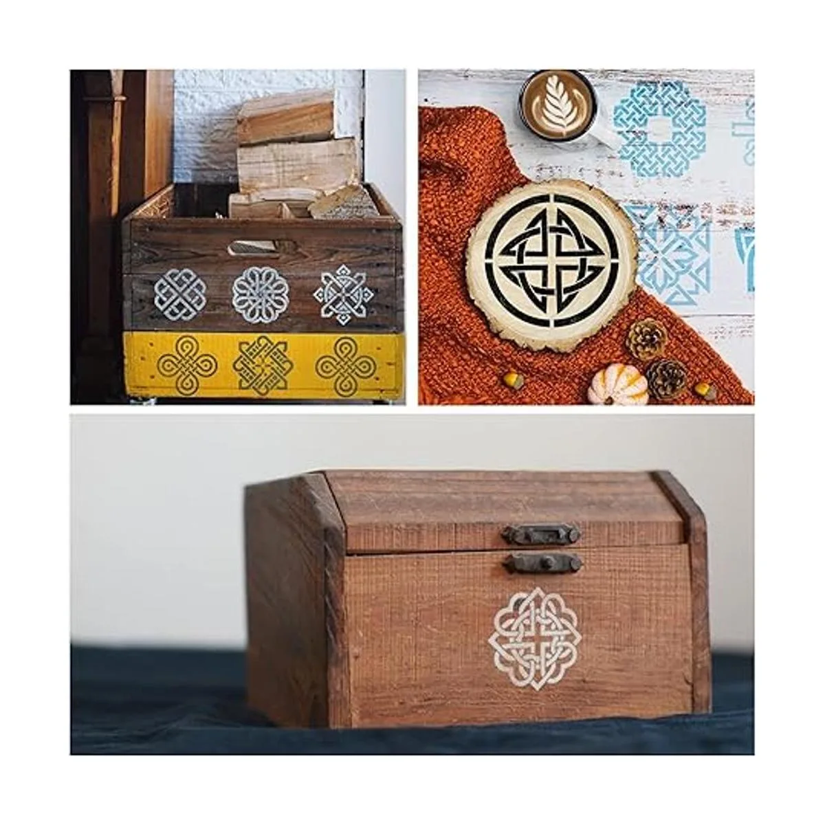 Múltiples usos: pintura, tallado, tallado de madera, bordado, acolchado, manualidades. El nudo celta añade un maravilloso detalle a la decoración de tu hogar y proyectos de bricolaje. Puedes pintar sobre madera, lienzo, muebles, suelos, álbumes de recortes, azulejos y vidrio. Estos hermosos símbolos celtas te dan una sorpresa distintiva.