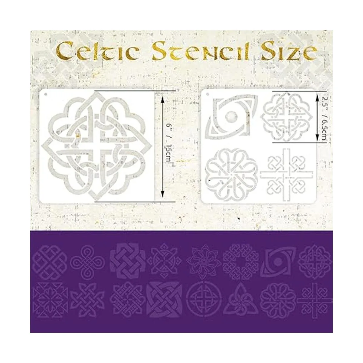 El paquete incluye 20 hojas de plantillas de nudo celta de 6 x 6 pulgadas. 16 patrones diseñados individualmente; 2 tamaños para cada patrón celta: aproximadamente 5.5 pulgadas y 2.5 pulgadas.