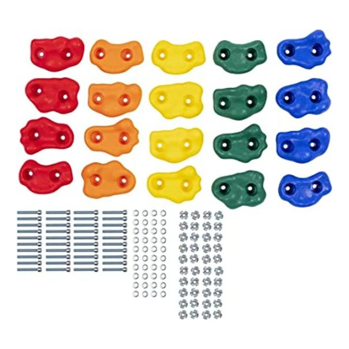 DETAILS: 20 rock climbing holds in assorted colors and shapes 1.25 Bolts, TNuts, Washers, instructions 3/16Allen wrench. Weather resistant plastic and zinc plated hardware for indoor or outdoor use. Boys girls age 3 up.
