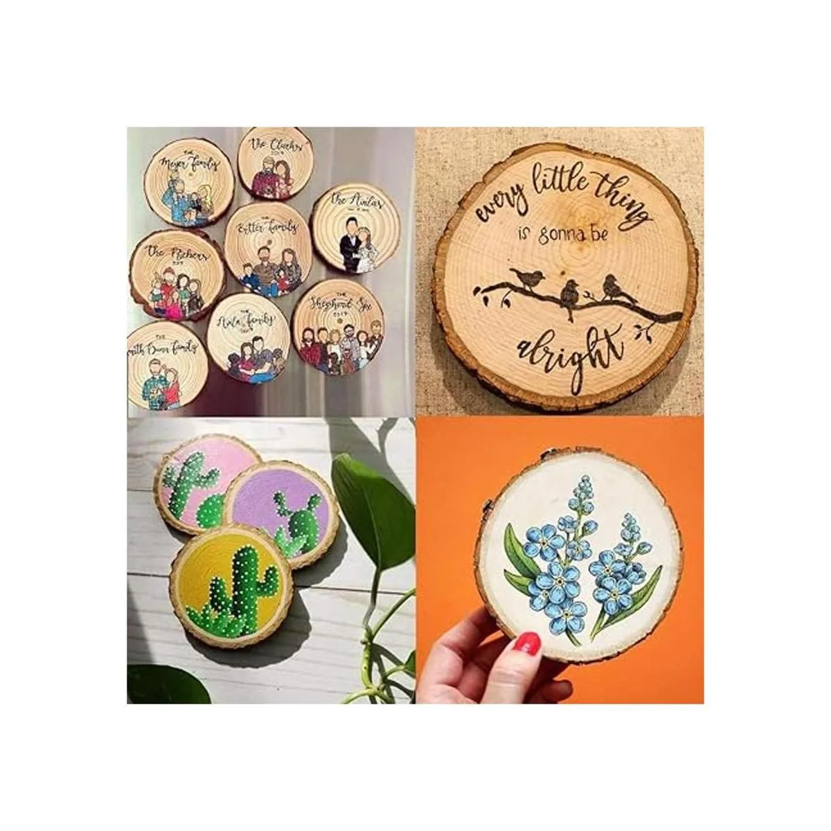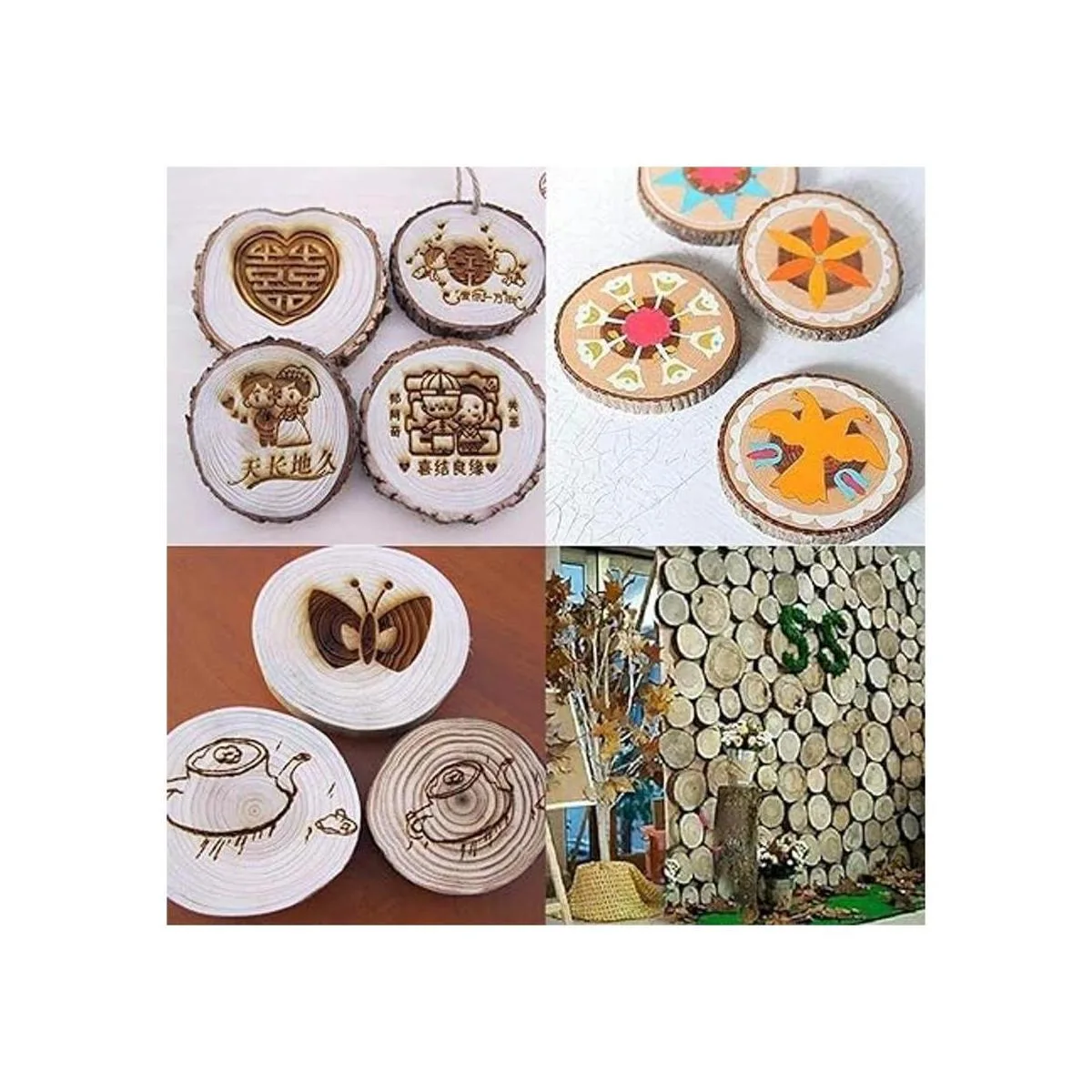 Material: madera de pino natural sin pintar, prelijada y pulida, algunas cortezas de madera podrán desprenderse parcialmente de las rodajas.