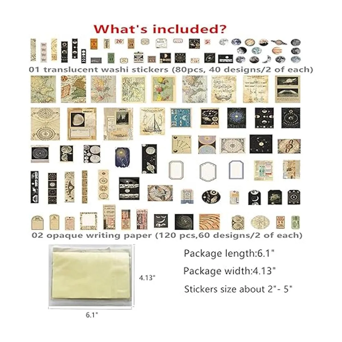 Paquete variado para diario de arte: kit de papel estético, hermoso, vintage y rústico surtido y calcomanías ephemera, incluye 120 piezas de papel de escritura mate opaco y 80 piezas de calcomanías washi translúcidas para diario de viñetas. Una hoja extra de calcomanías transparentes alrededor de 120 piezas. Haz que cada diseño sea pegado para suministros de diario de viñetas.