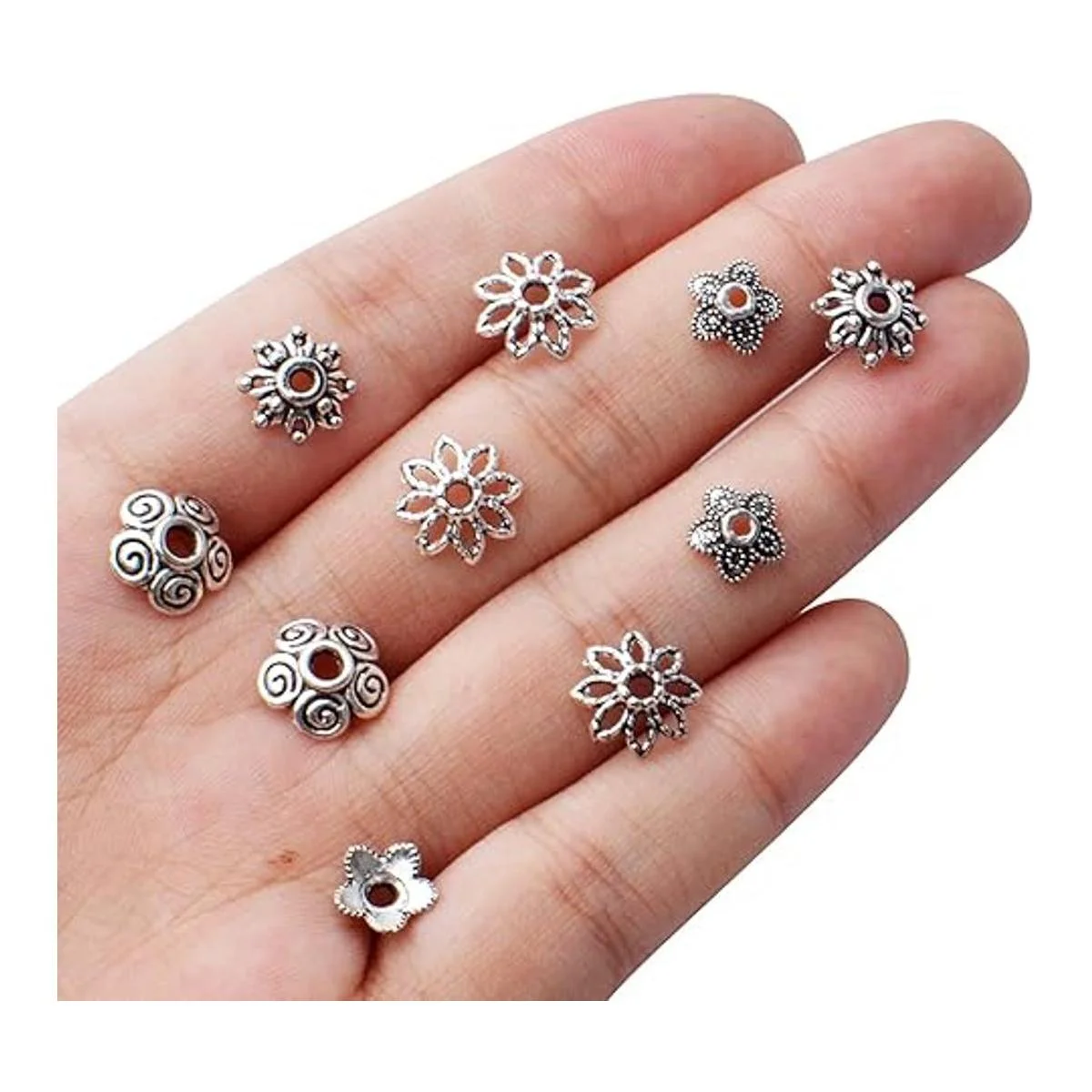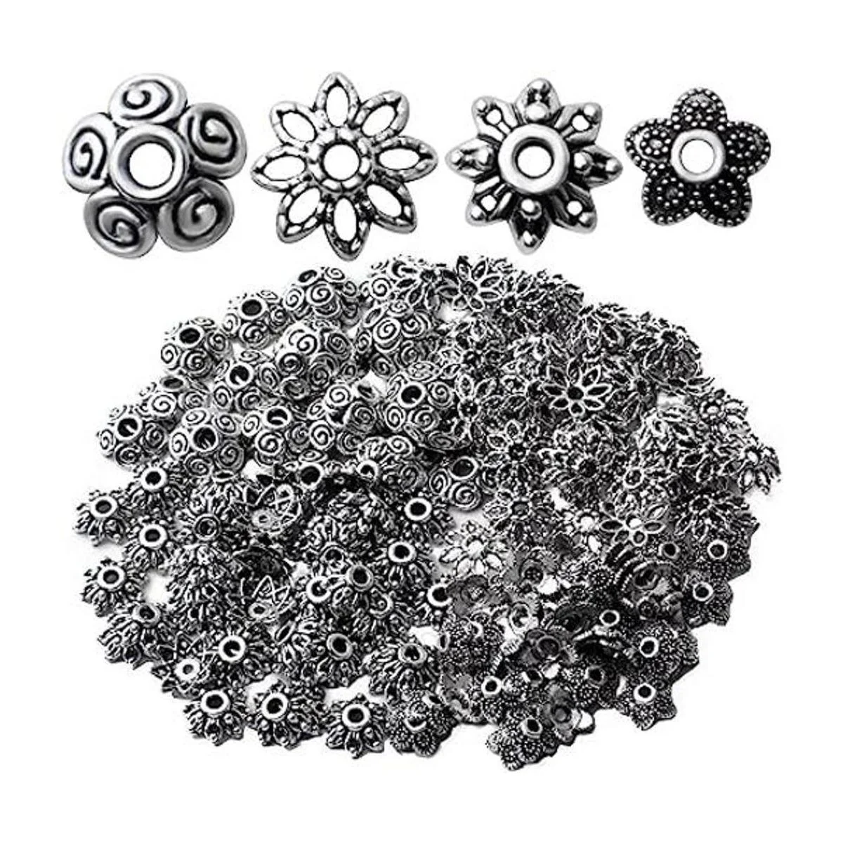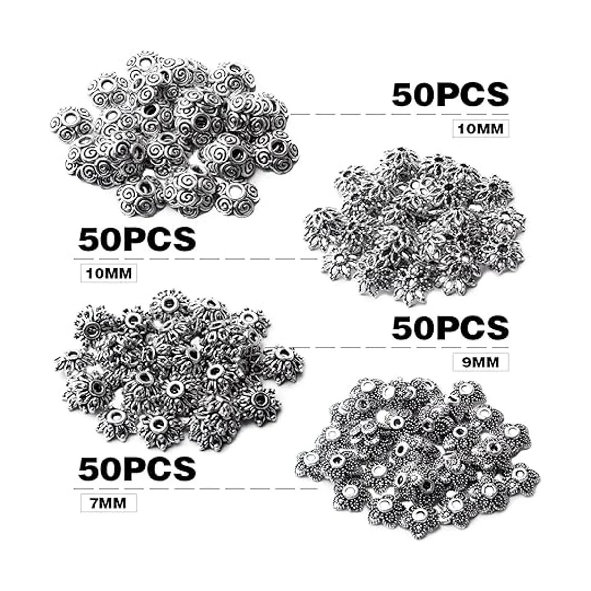 200 casquillos de cuentas espaciadoras, tapas de cuentas de plata antiguas de aleación tibetana de cuentas de cuentas de cuentas para pendientes, pulseras, collares, joyas, manualidades, 4 estilos