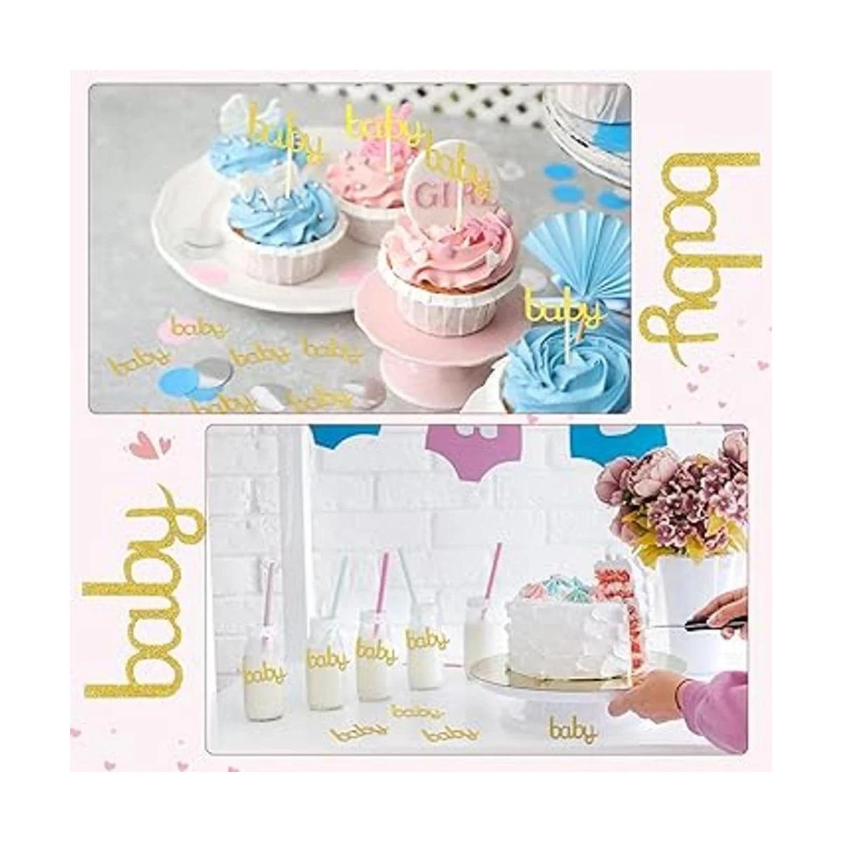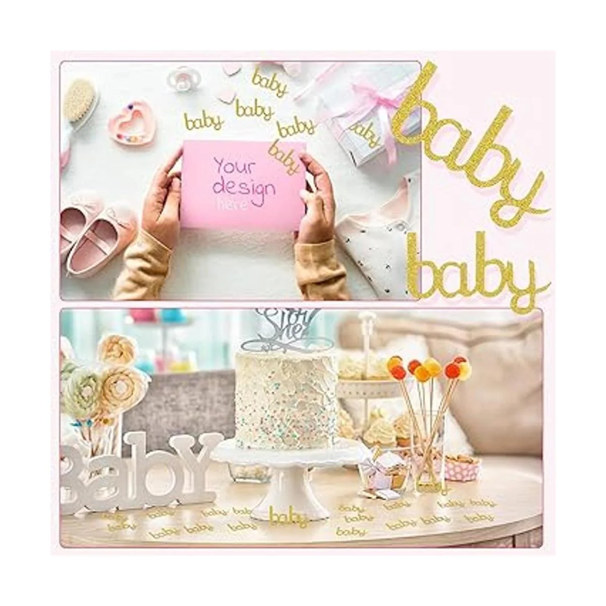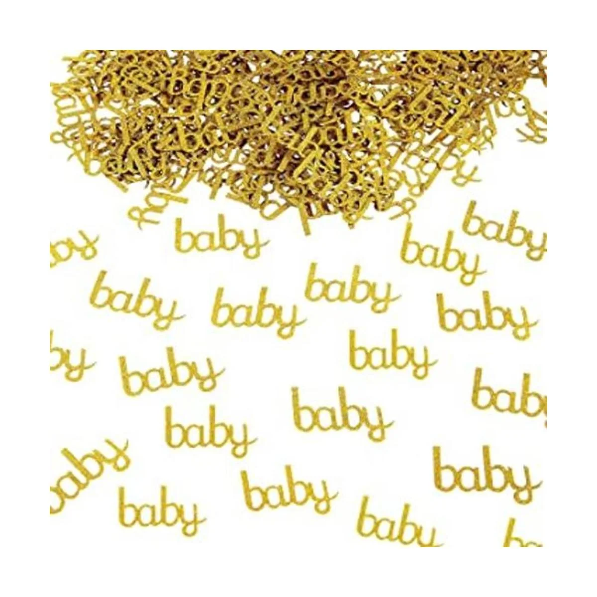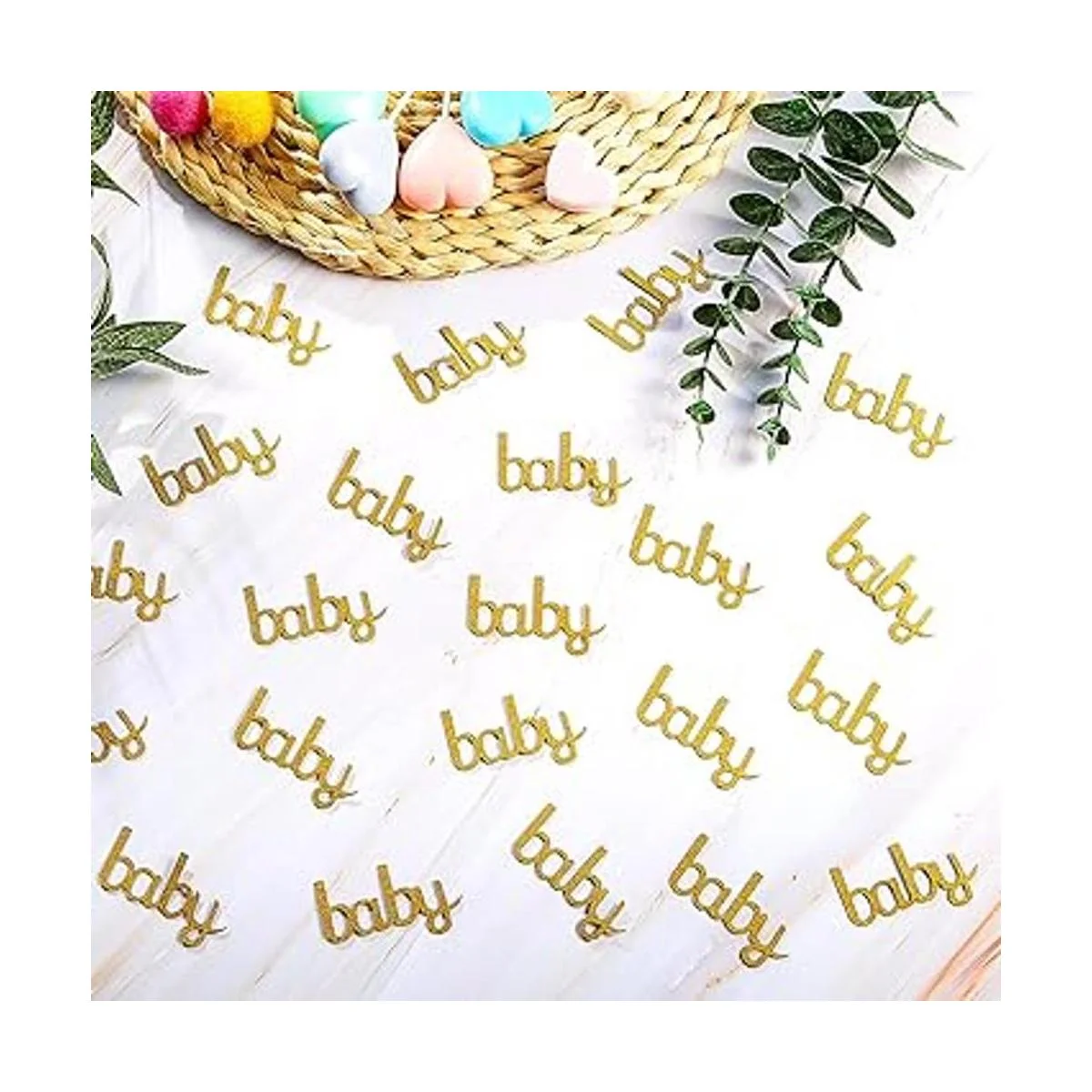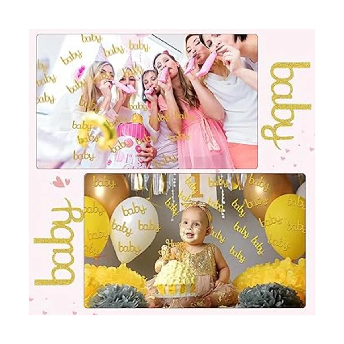 Apariencia delicada: estos confeti de revelación de género están diseñados en letras huecas con las palabras Baby, que están en línea con el tema de fiesta de baby shower; la superficie está punteada con purpurina dorada, que brilla bajo la iluminación de las luces y se ve elegante y encantadora
