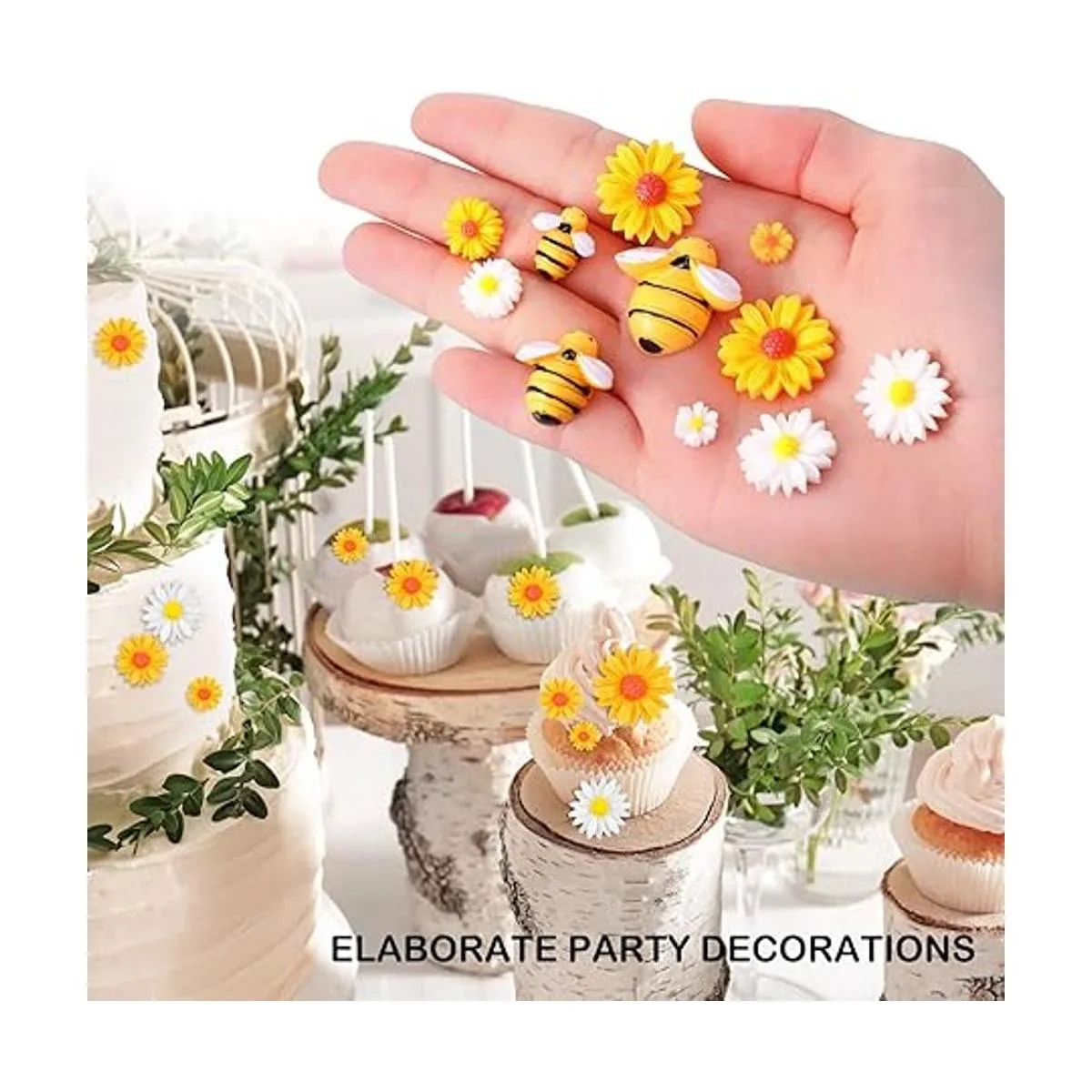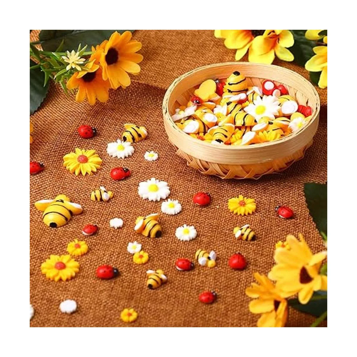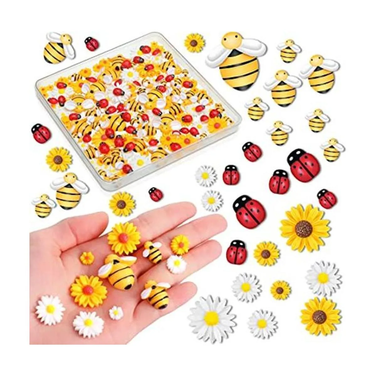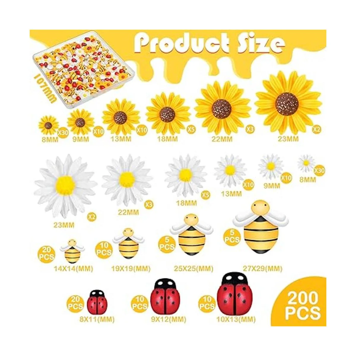 200 piezas de mini cuentas de resina de girasol y abejas con parte trasera plana, adornos de mariquitas de madera, varios tamaños, pequeñas margaritas de resina y abejas decoración para manualidades, caja de bolígrafos de tela, decoración del hogar