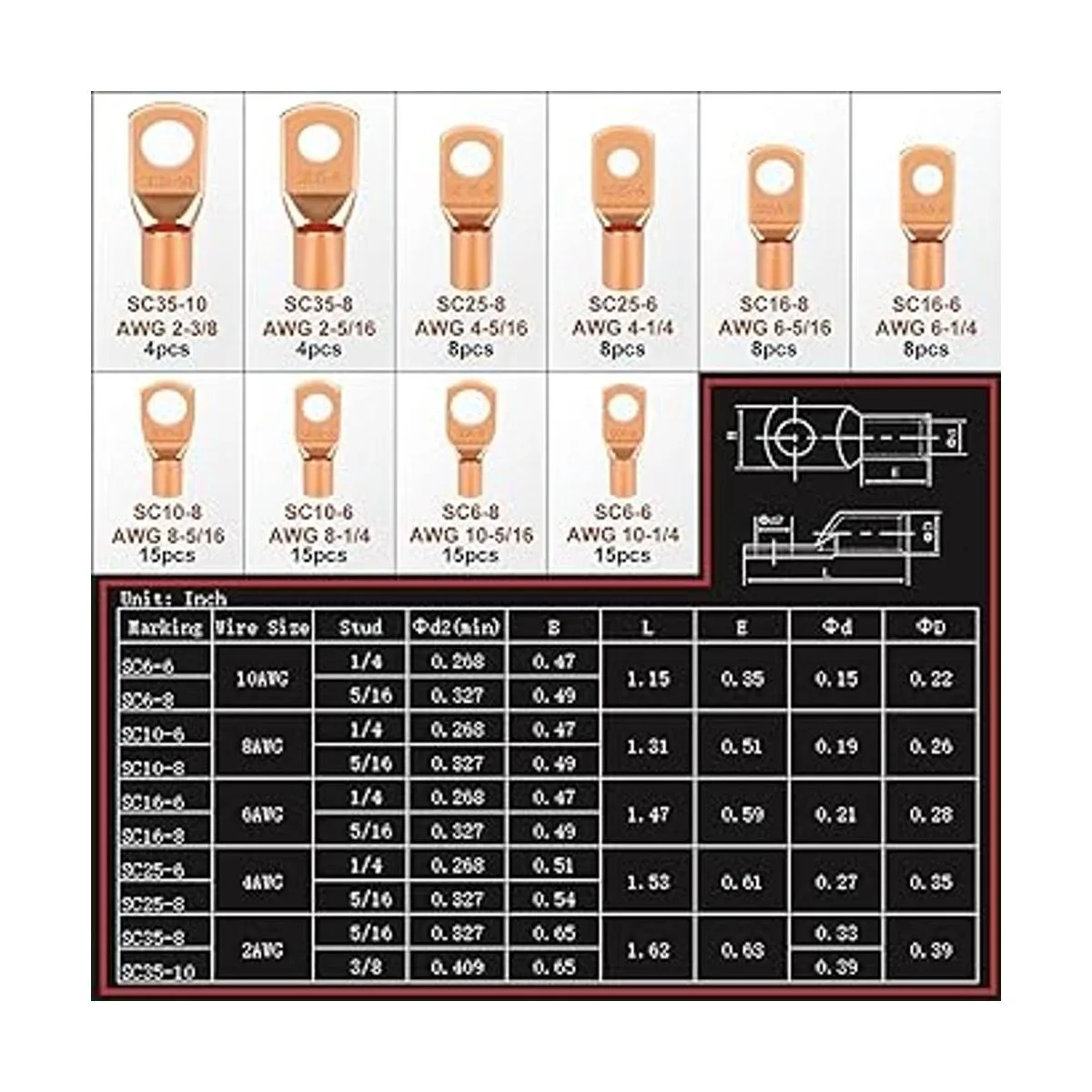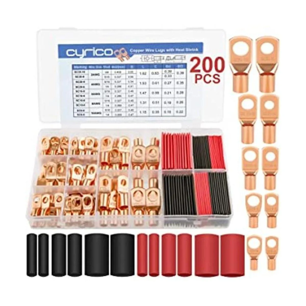 200 terminales de cable de batería, terminales de alambre de cobre AWG 2, 4, 6, 8, 10, 100 conectores de terminal de anillo con 100 piezas de termorretráctiles para suministros eléctricos de automóviles marinos