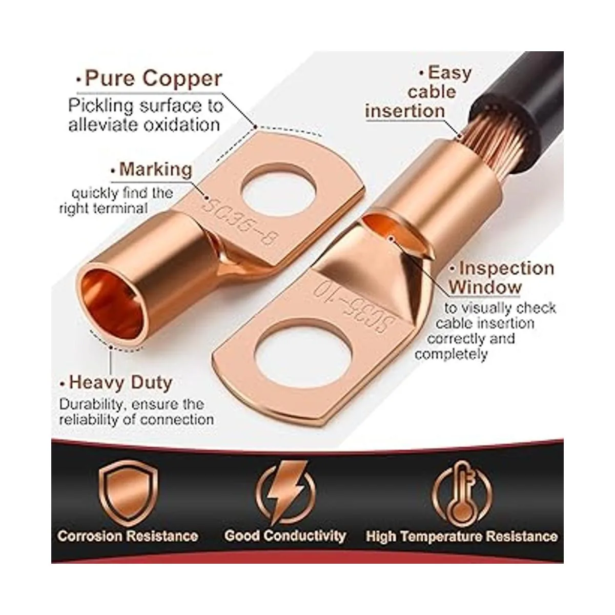 Calidad prémium: los extremos del cable de batería resistentes están hechos de cobre morado de buen conductor, resistente al calor y a la corrosión para garantizar la fiabilidad de la conexión. El encurtido superficial mitiga la oxidación. La apertura estándar de las lengetas facilita la inserción de alambre. La ventana de inspección está diseñada para comprobar la inserción correcta y completa del cable. Cada lengeta de alambre tiene una marca de especificación, por lo que puedes encontrar rápidamente el terminal correcto. Las lengetas de alambre de cobre se pueden engarzar o soldar fácilmente y de forma segura al cable.