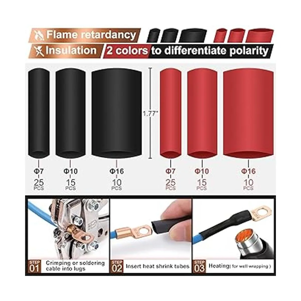 Fácil instalación: las lengetas de la batería se utilizan junto con el termorretráctil para consumo de energía o conexión a tierra, lo que hace que el cableado sea seguro, fiable y funciona profesionalmente. Retardante de llama y termorretráctil aislado está hecho de poliolefina, que está precortada en tamaños comunes para la selección para mejorar la eficiencia de trabajo. Crimpa o suelda el cable en lengetas de alambre de cobre, inserta el termorretráctil, aplica al calor. Se encoge rápidamente y envuelve bien el cable. El color rojo y negro nos hace identificar rápidamente cables positivos y negativos.