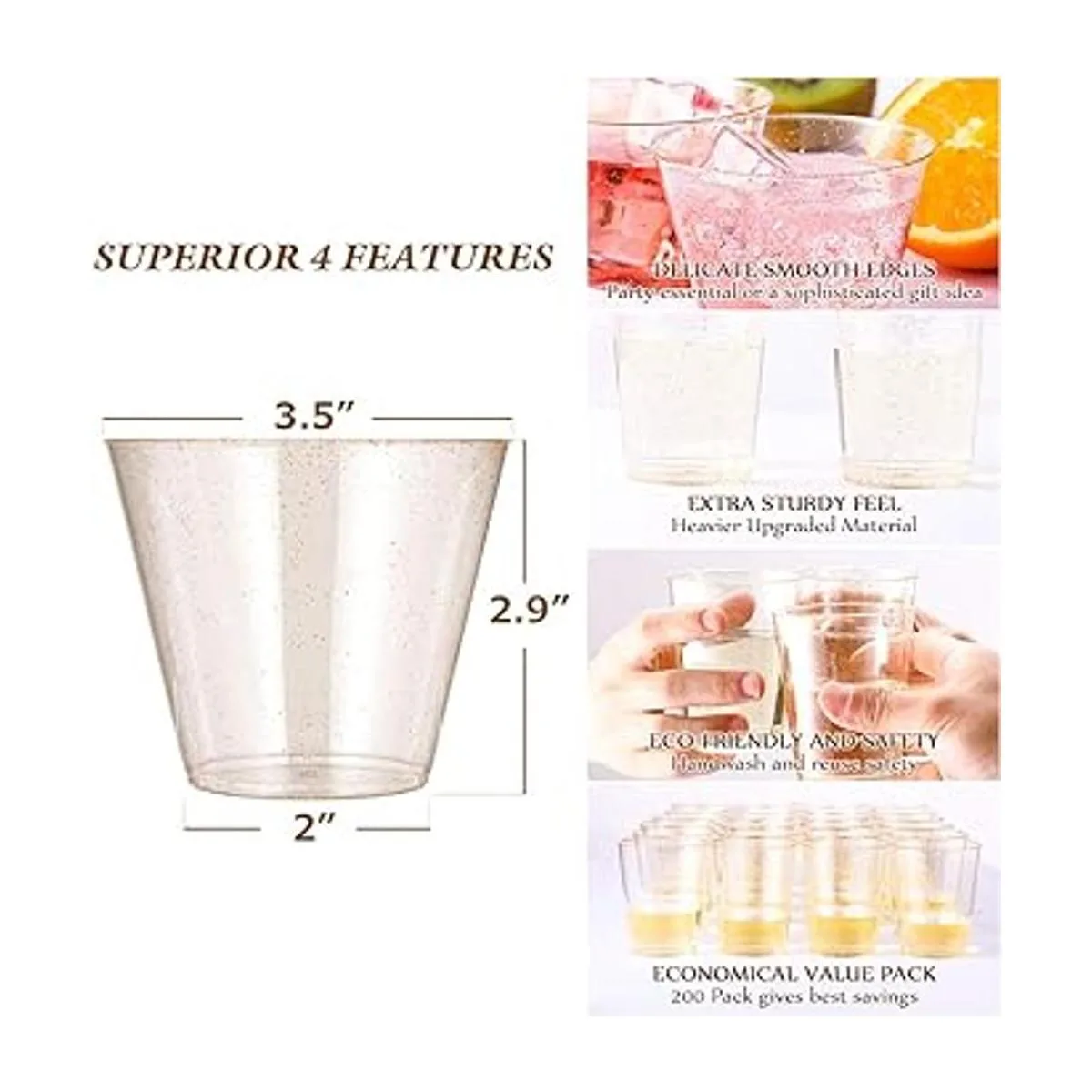 Aspecto elegante: el cuerpo de la taza de plástico está lleno de destellos dorados y es perfecto para cualquier fiesta especial, incluyendo Halloween, Acción de Gracias y Navidad. La purpurina dorada se puede combinar con cualquier color de la bebida para hacer que tu fiesta sea elegante y refinada. Paquete de 200