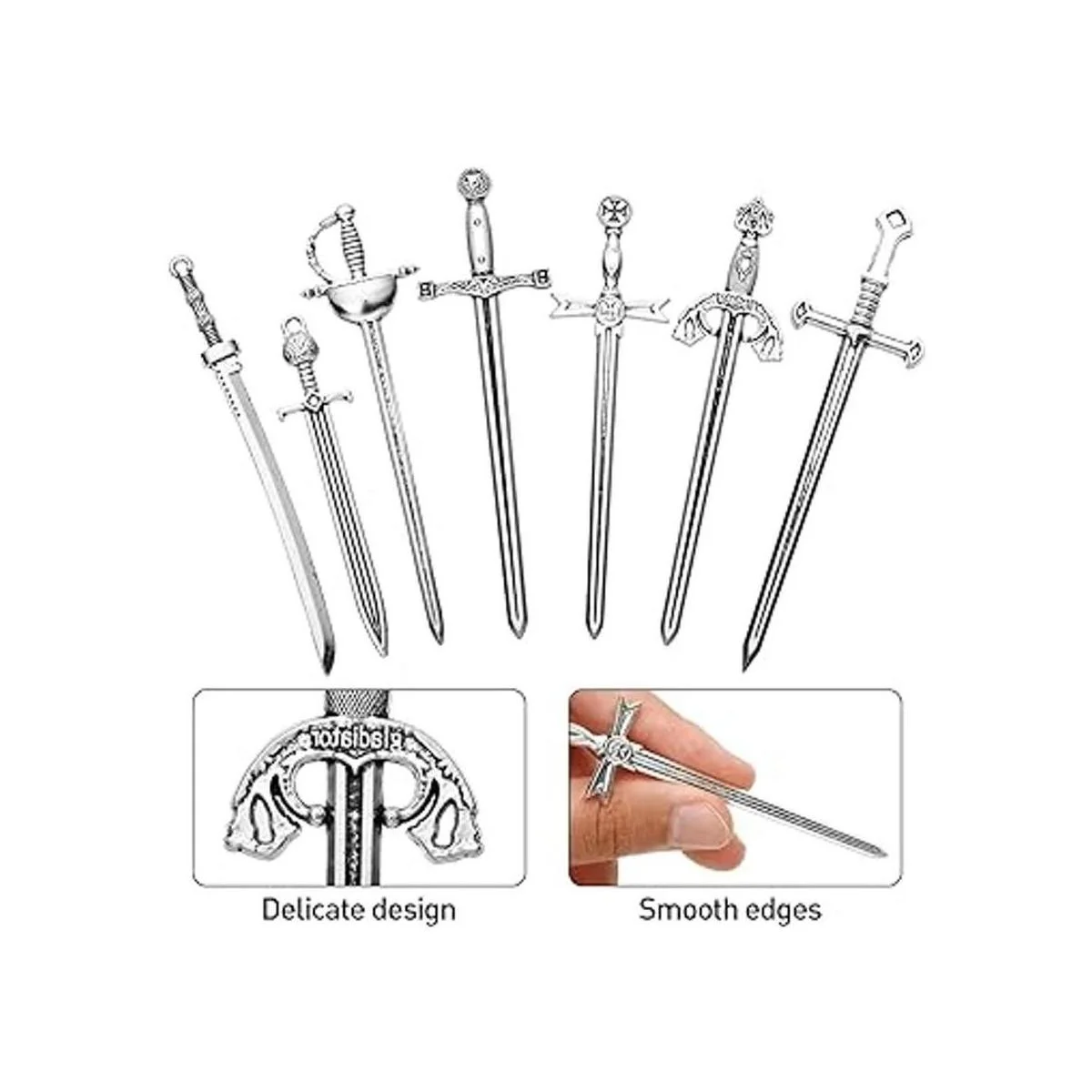 Material fiable: estos marcadores de cuchillos de espadas están hechos de aleación, no se decoloran ni rompen fácilmente, también son pequeños, ligeros y fáciles de usar; ten en cuenta que hay ligeras esquinas puntiagudas en algunas partes de este producto; úsalo cuidadosamente