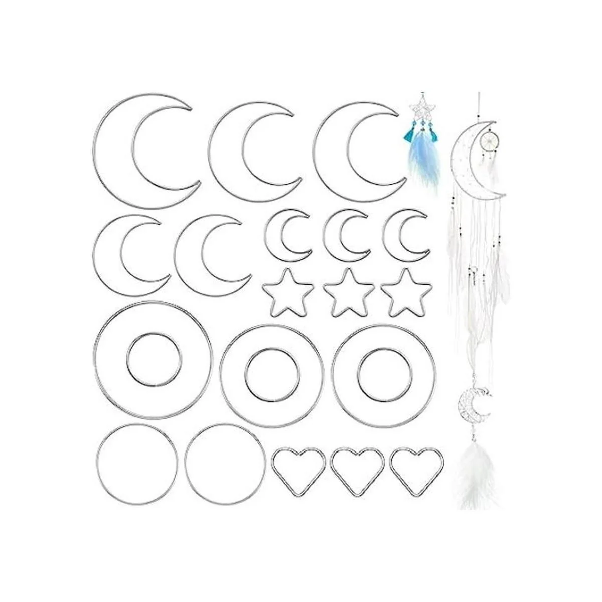 22 anillos de metal para atrapasueños, aros de macramé redondos de estrella, luna, forma de corazón, anillos de macramé para manualidades, atrapasueños, hacer decoración de corona para colgar en la pared plata