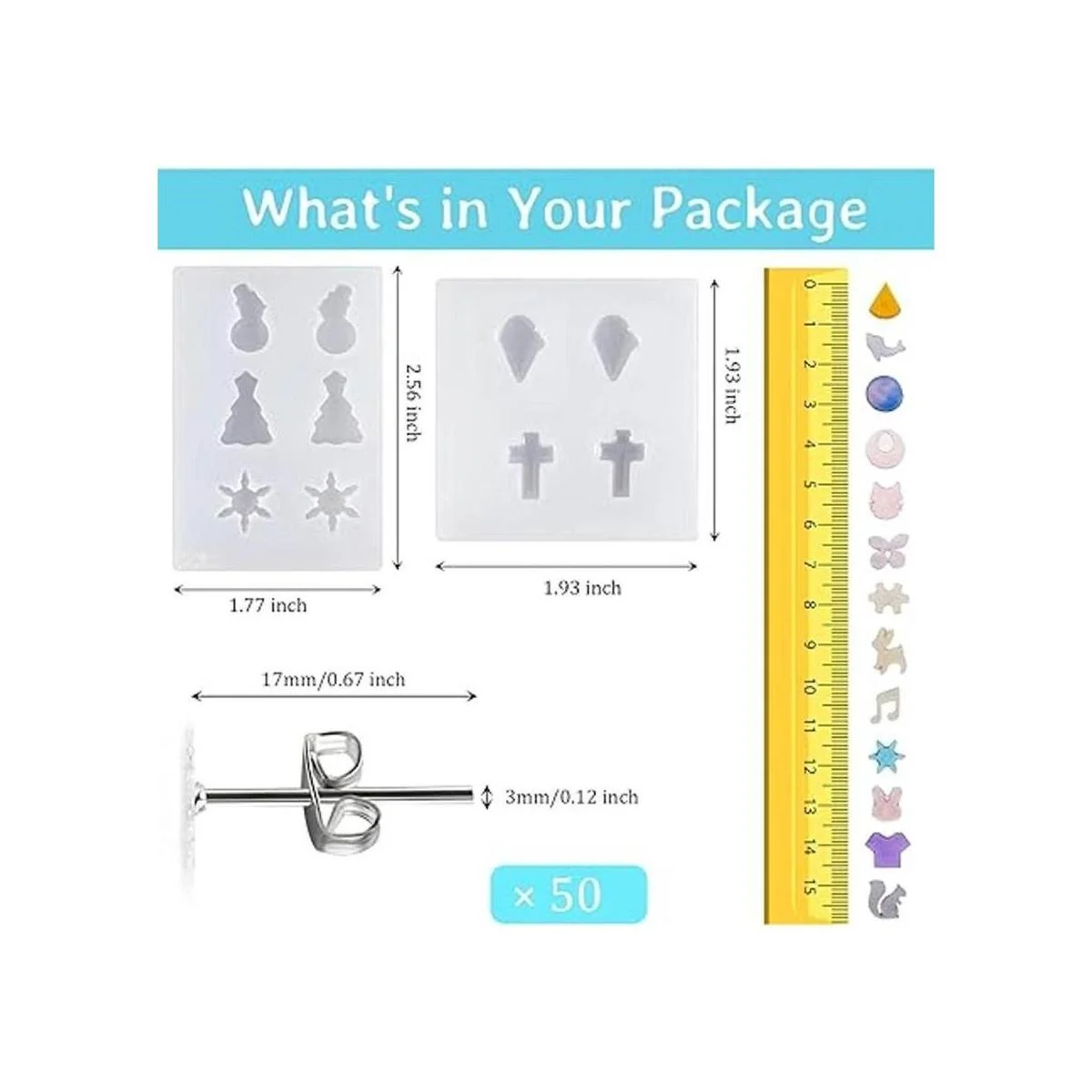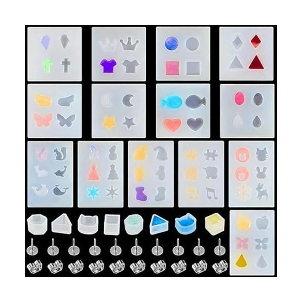 Amplio juego de fabricación: el paquete te trae 14 moldes de resina para aretes y aretes con varios patrones, 8 moldes de resina en diferentes estilos, 50 aretes de acero inoxidable y 50 piezas de respaldo, que te permiten hacer o hacer tus propios aretes para que coincida con tus atuendos diarios y suficiente para que elijas