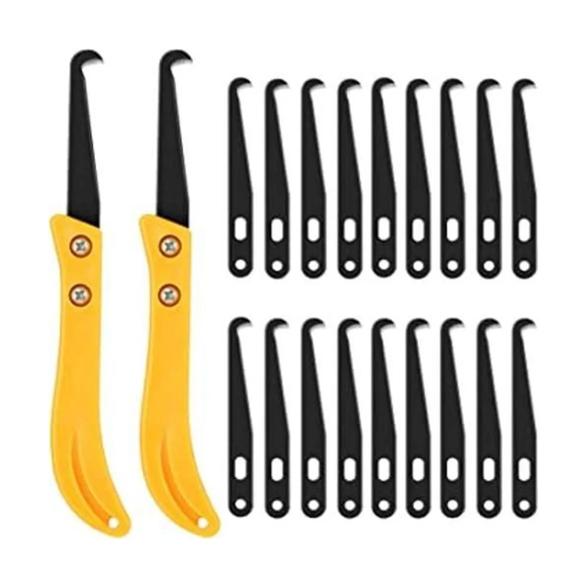 Cabezal de cortador reemplazable: viene con 20 cabezales de cortador para reemplazar; cuchillo de acero, diseño de gancho, puede limpiar mejor las manchas entre los huecos; tornillos ajustables para el reemplazo de cuchillo para un trabajo más eficiente; Consejo: el cabezal de cuchillo está puntiagudo, úselo cuidadosamente, ten cuidado de lesiones.