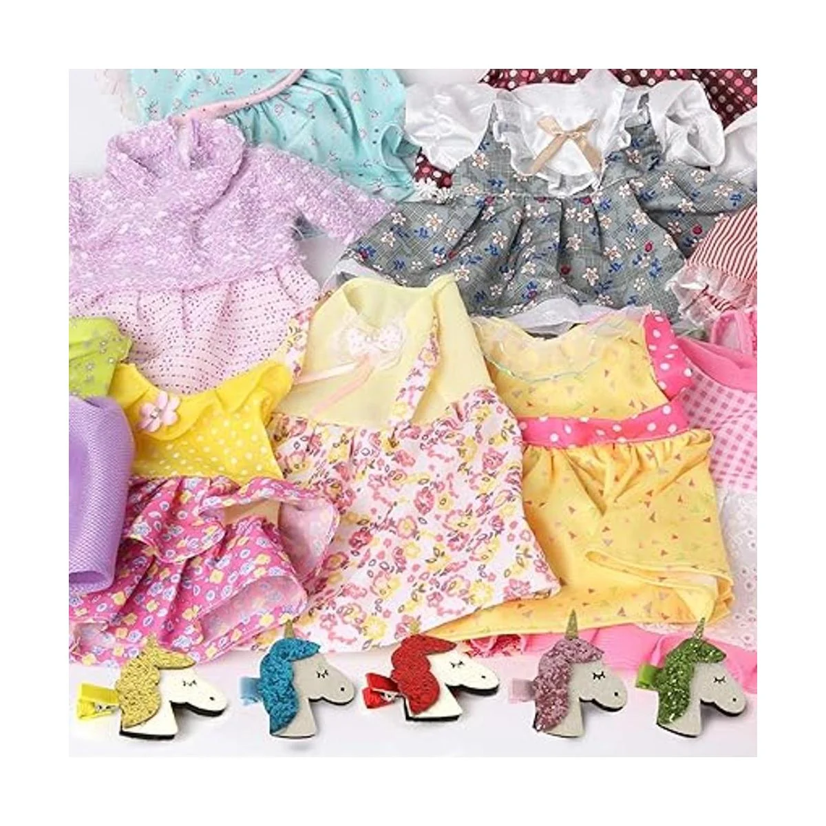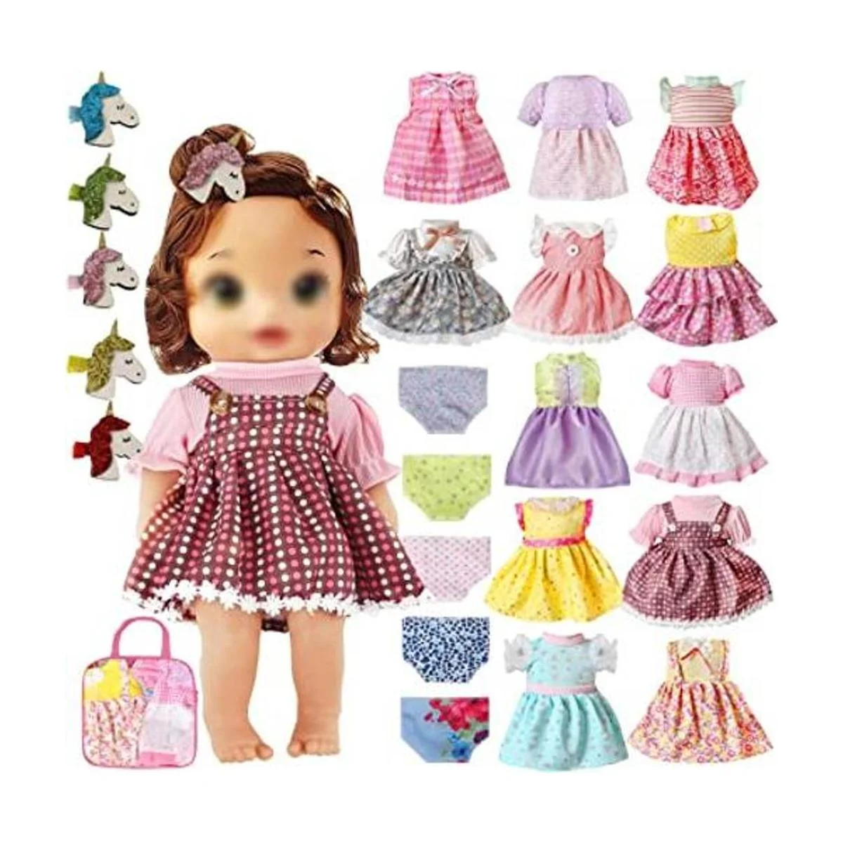Detalles del paquete: 12 juegos de ropa y vestido de muñeca de bebé de diferentes estilos, 5 horquillas brillantes de unimaíz y 5 lindas prendas interiores para muñecas al azar. Ten en cuenta que la muñeca no está incluida, gracias.