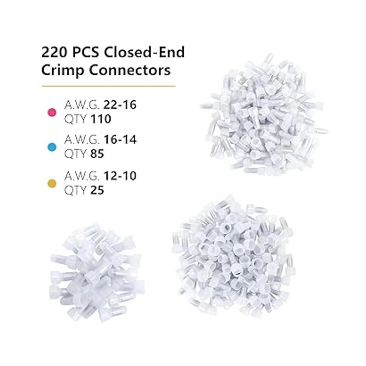 El paquete incluye: 110 tapas de engarce de 2216 AWG CE1, 85 tapas de engarce de 1614 AWG CE2, 25 tapas de engarce de 1210 AWG CE5