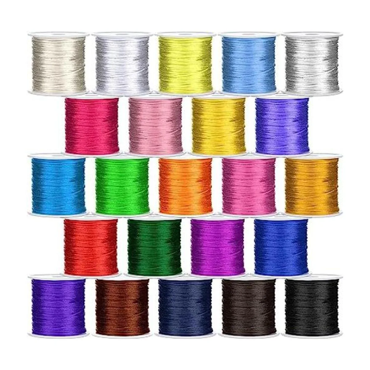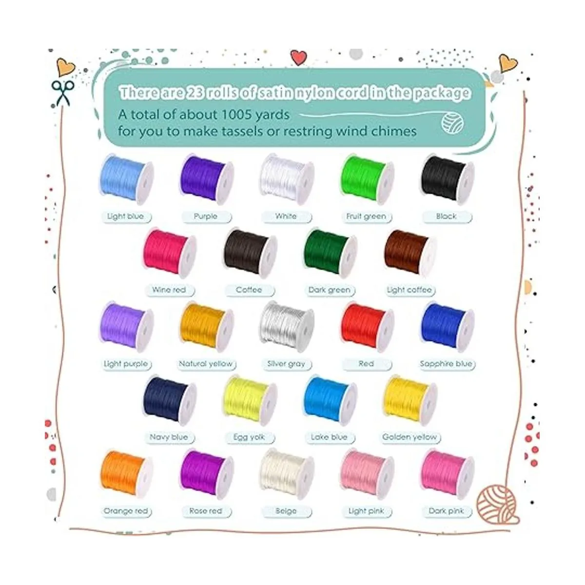 Abundante para usar y reemplazar: hay 23 rollos de cordón de nailon satinado en el paquete, que vienen en 23 colores elegantes y vibrantes, suficientes para satisfacer tus diversas necesidades de decoración y manualidades