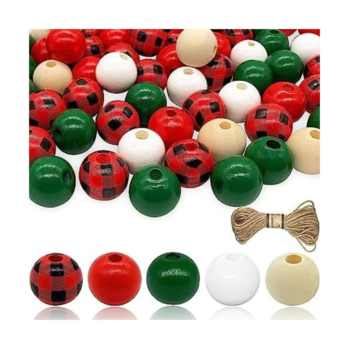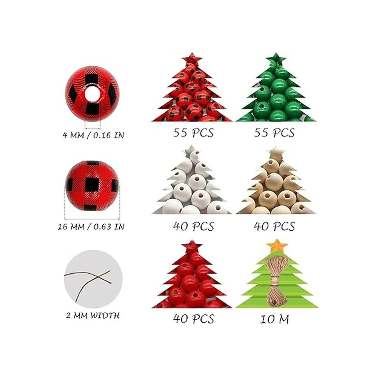 230 cuentas redondas de madera a cuadros de búfalo sueltas cuentas de madera de 0.630 in, cuentas espaciadoras pintadas con cuerda de cáñamo para decoración de fiestas de Navidad, guirnaldas, pulseras de bricolaje para hacer manualidades