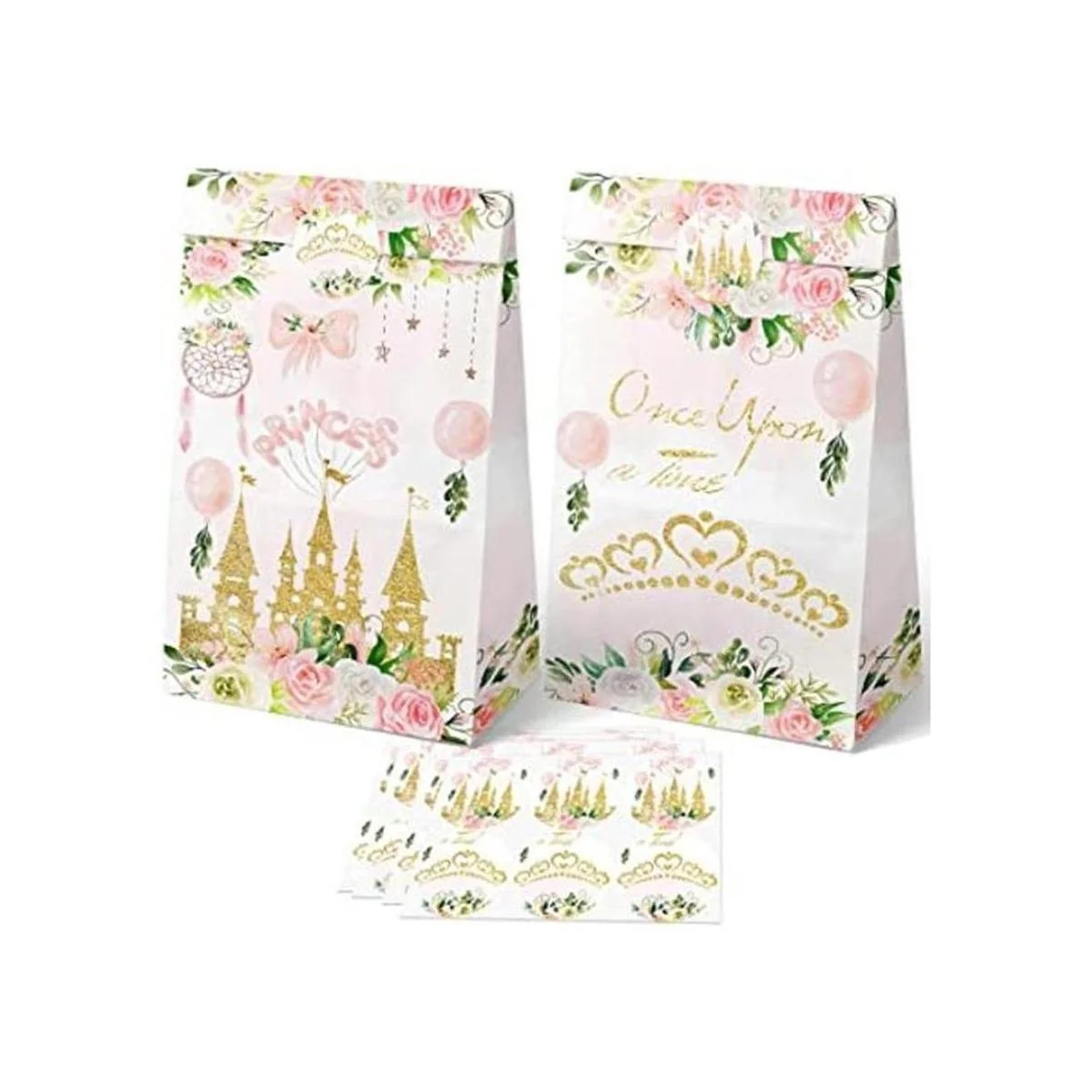 El paquete incluye: 24 bolsas de dulces de princesa y calcomanías